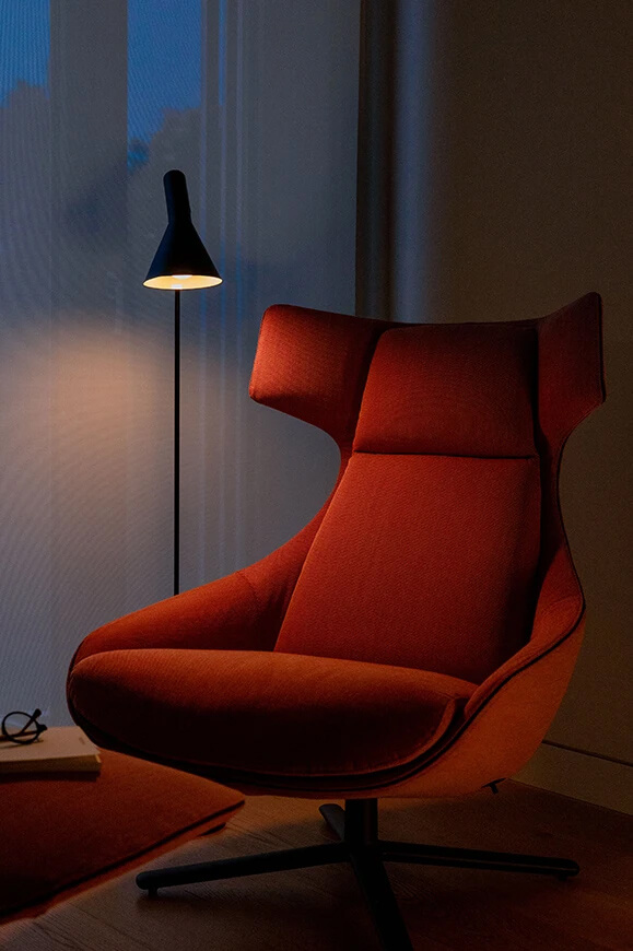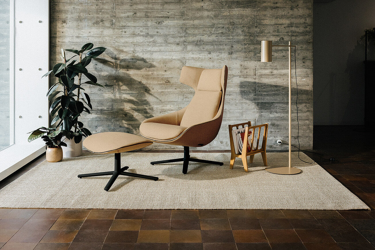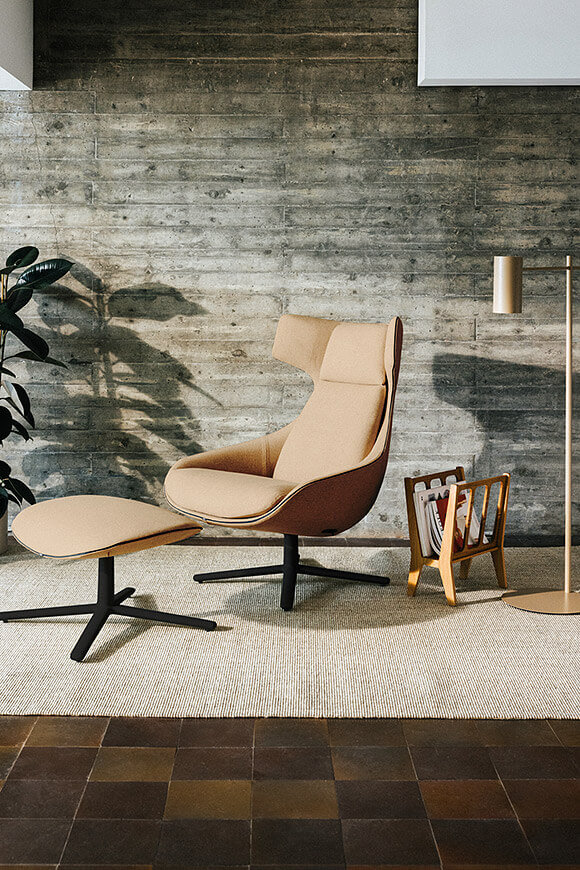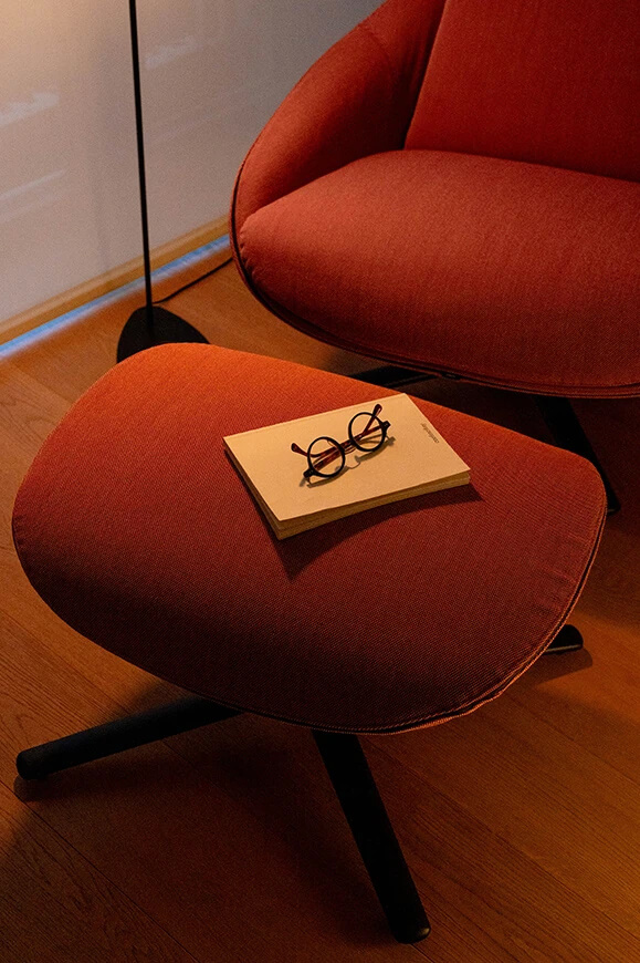 The Kua 4R ottoman features a fully upholstered seat and a fixed four-star aluminium base, which can be polished or lacquered in any of our colours. It is the ideal complement as a footrest for the armchair from the same collection. This piece certainly has a place in the home, in waiting rooms in the hospitality sector, and in corporate environments.
