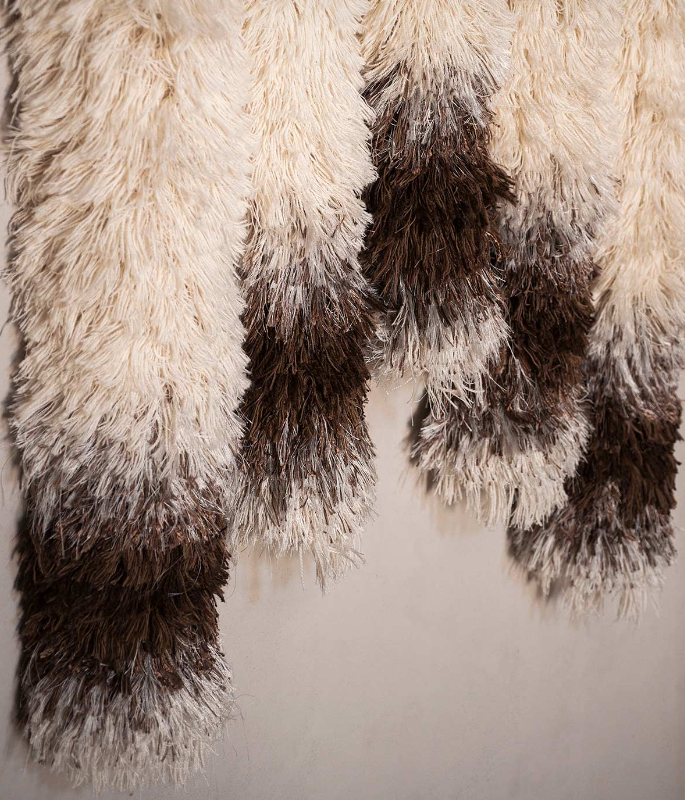 In German, “l(fā)eise” means silent. Inspired by the warmth and quiet that tapestries have given to interior spaces for centuries, Salem van der Swaagh created a wall hanging for Tacchini that fuses tactile and visual sensations in a textile work that invites slow, silent exploration. Leise takes shape from a meticulous manual knotting technique that defines its volume and texture – from the rich white tones to the ends that seem almost immersed in gold – in a tonal and material transformation that creates a rich and harmonious contrast. An invitation to slow and silent exploration to grasp the poetics of tactile sensations in a continuous balance between wild and tamed, raw and worked.