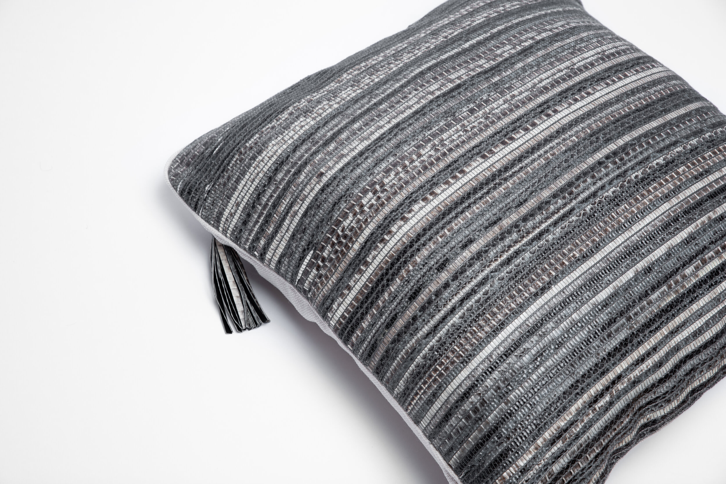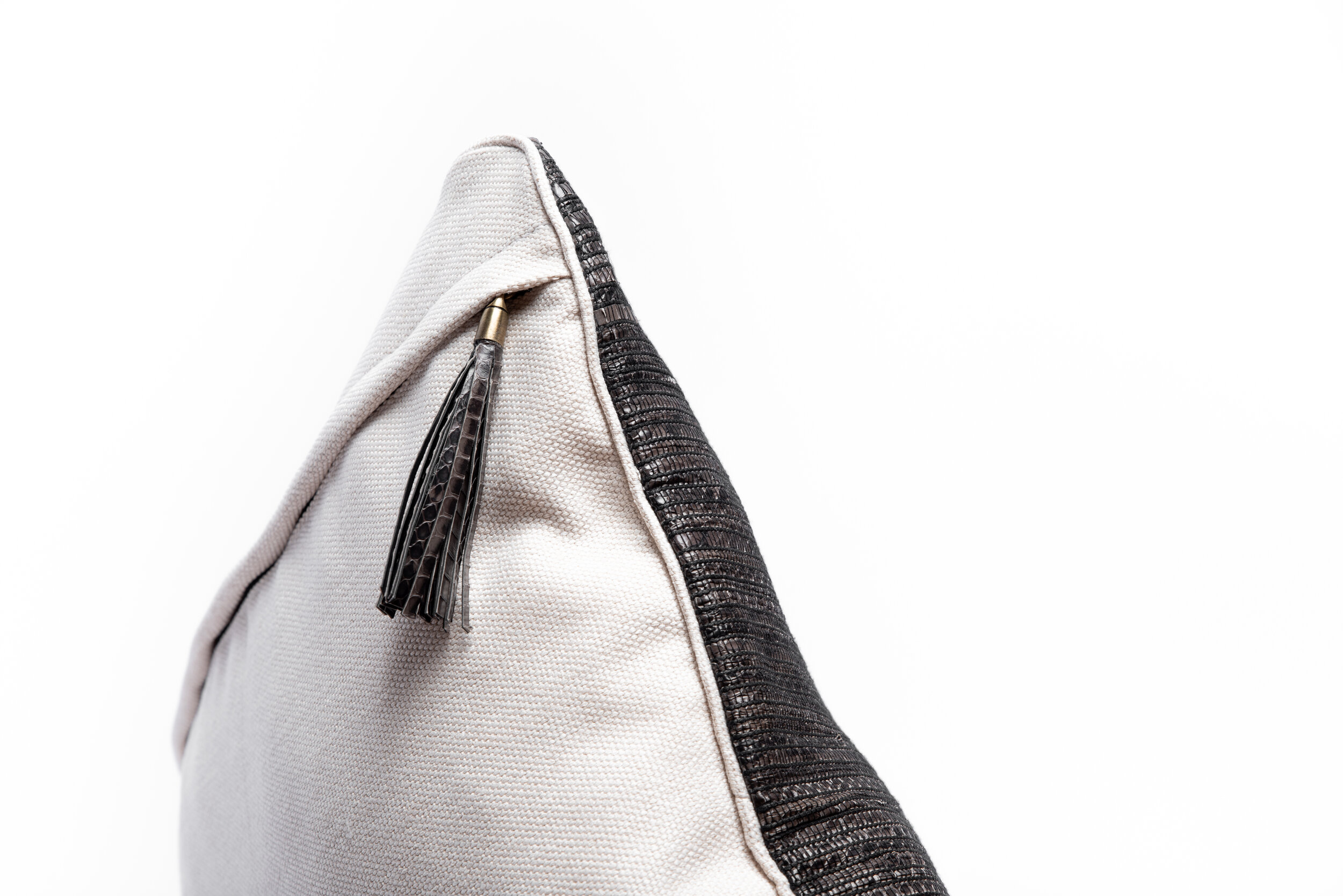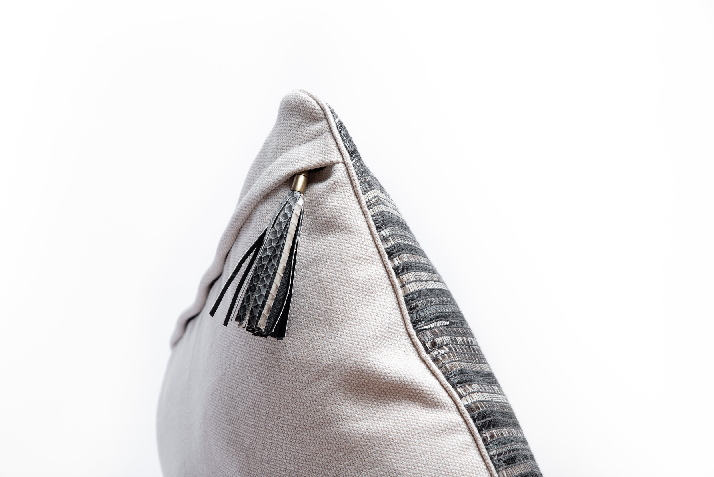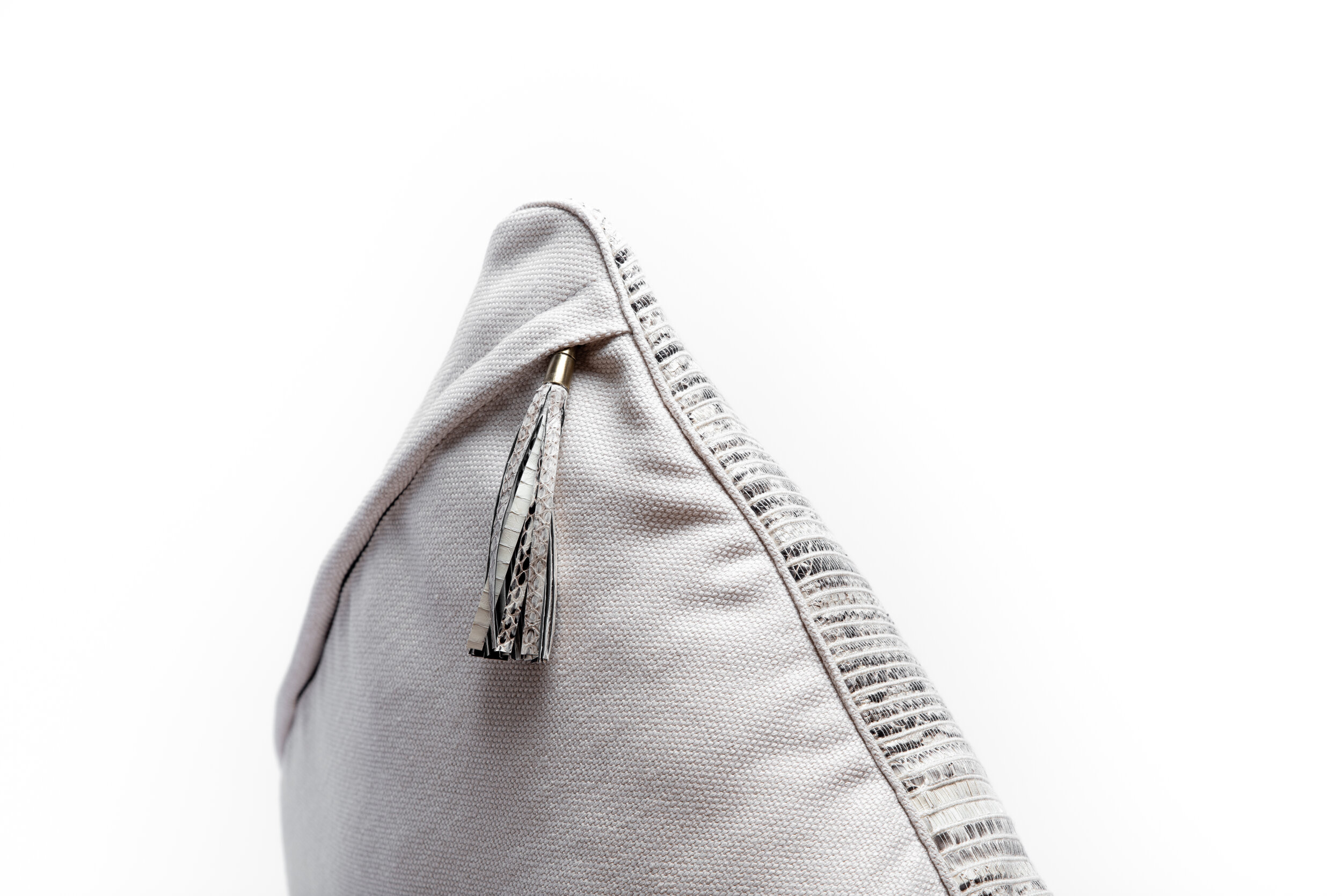 The Woven Snakeskin Cushion by KIFU PARIS is the ultimate luxury home textile piece. This textile is unique and original to the brand, who uses traditional weaving techniques with wooden looms to develop this supple and exotic textile. The back is in a cream sturdy cotton with white leather piping and the zipper is finished with a snakeskin and brass tassel. Available in a square or a rectangle shape and in 3 color choices: natural snakeskin, two tone grey snakeskin or dark grey snakeskin.