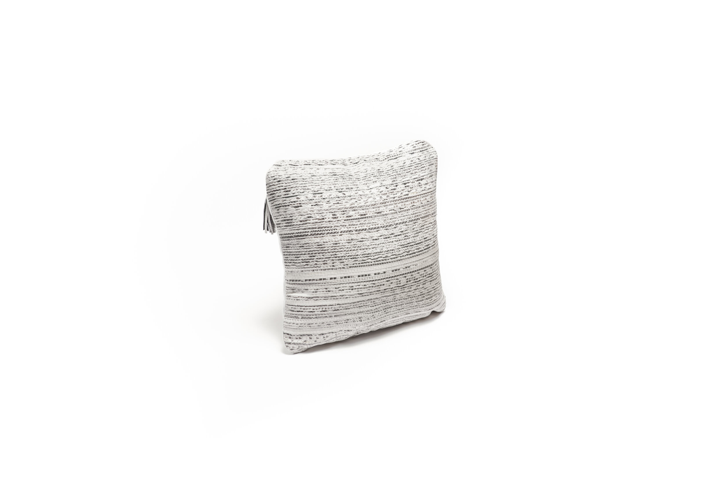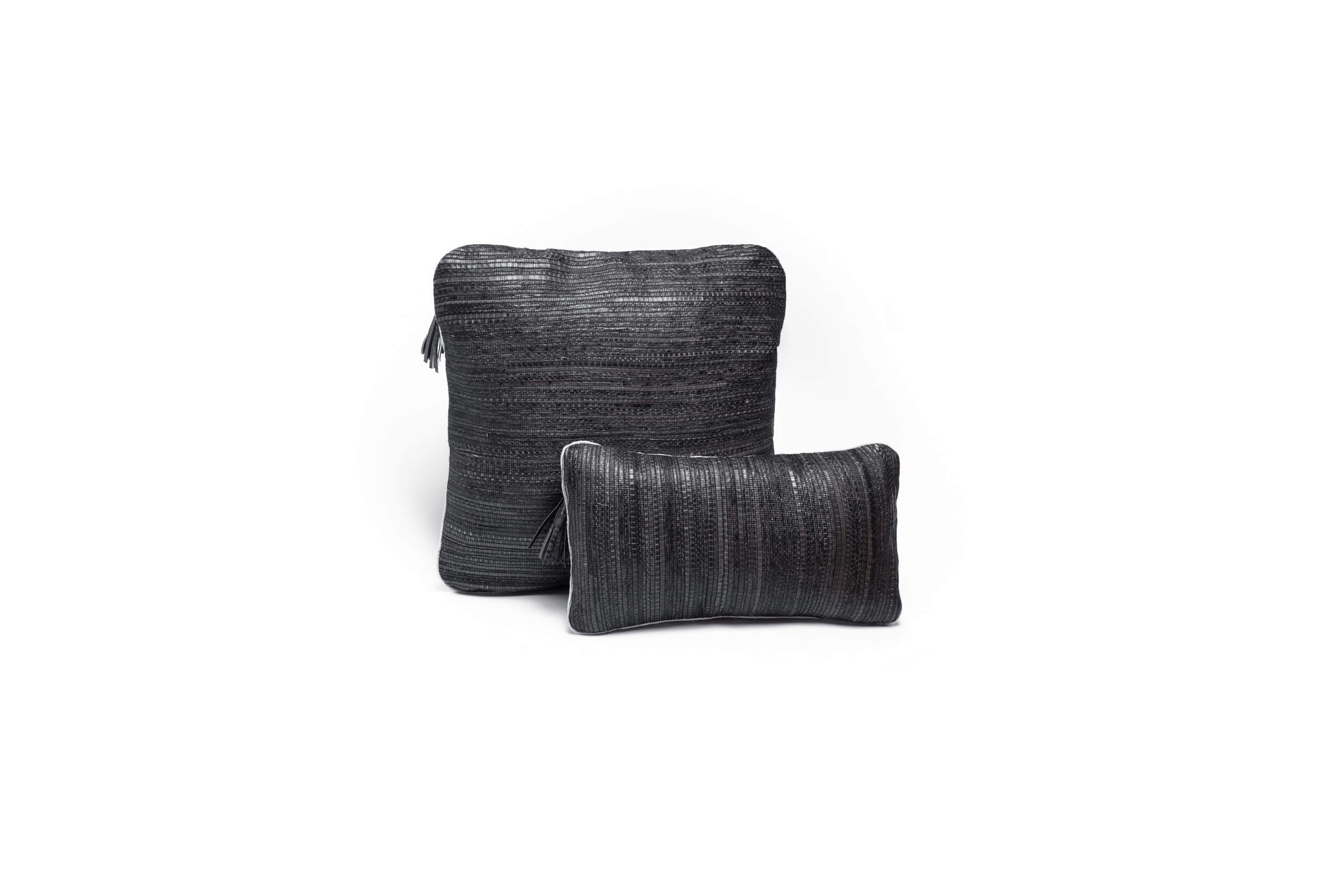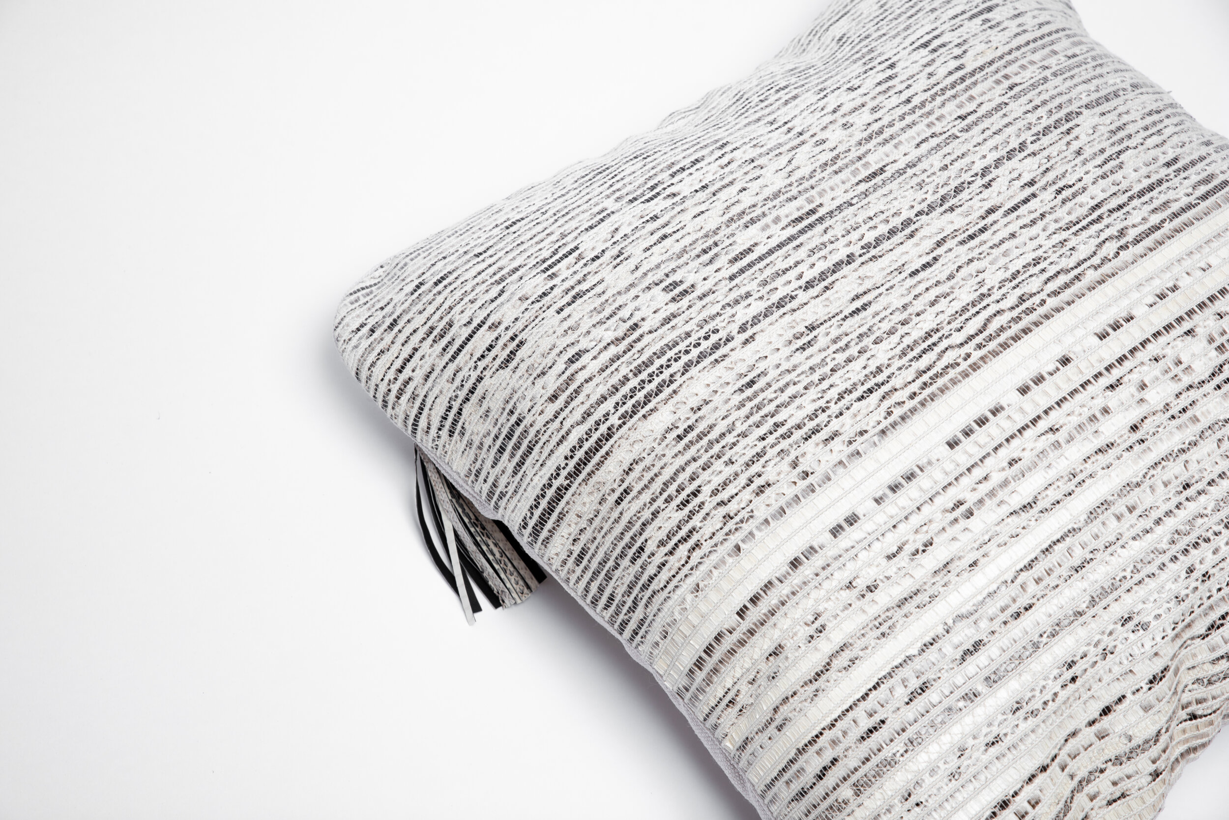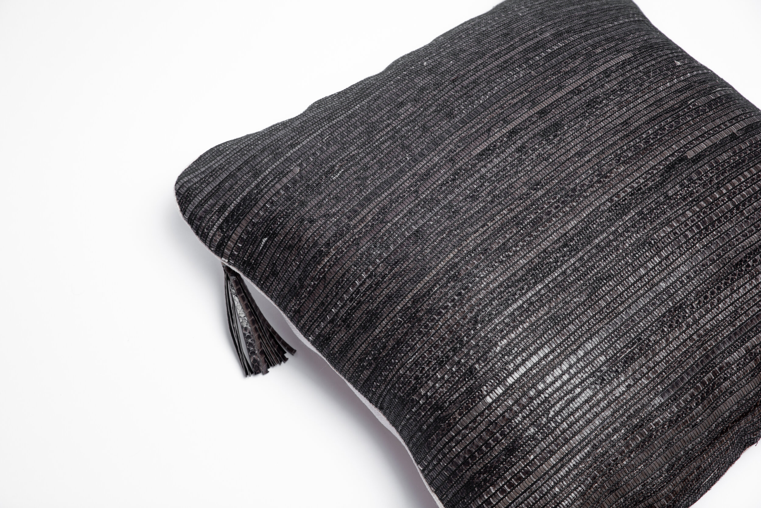 The Woven Snakeskin Cushion by KIFU PARIS is the ultimate luxury home textile piece. This textile is unique and original to the brand, who uses traditional weaving techniques with wooden looms to develop this supple and exotic textile. The back is in a cream sturdy cotton with white leather piping and the zipper is finished with a snakeskin and brass tassel. Available in a square or a rectangle shape and in 3 color choices: natural snakeskin, two tone grey snakeskin or dark grey snakeskin.