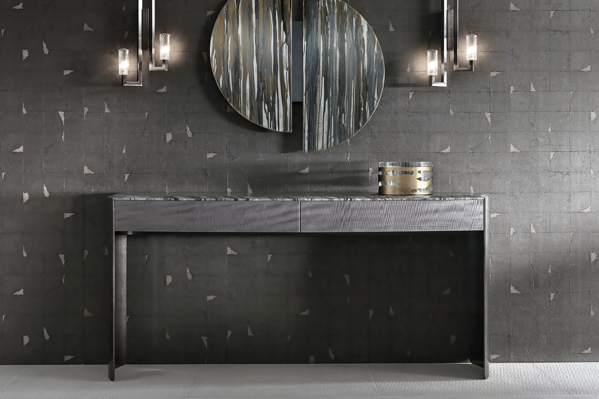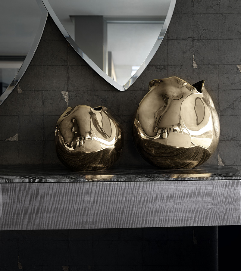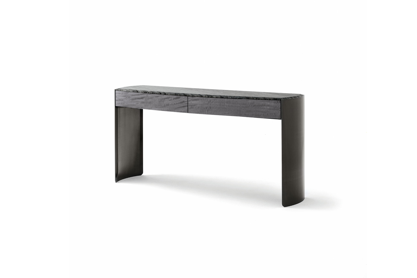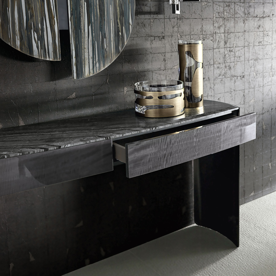 Consolle in Madagascar figured Mowinghi veneer with high gloss polyester finish. Top in Kenya Black marble. Curved legs in satin black nickel stainless steel with lasered Giorgio Collection logo. 2 external full extension drawers with bottom part in velvet fabric.
