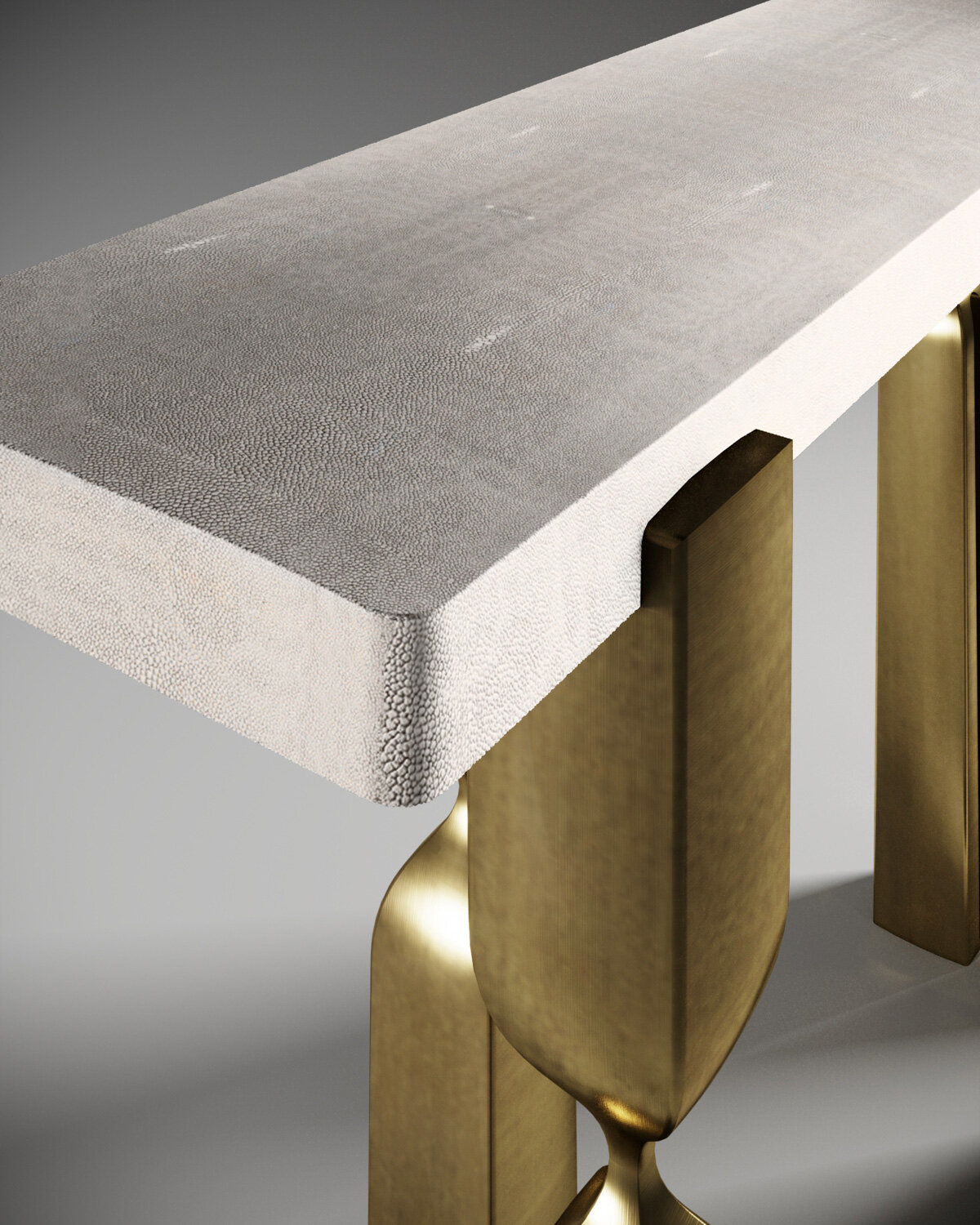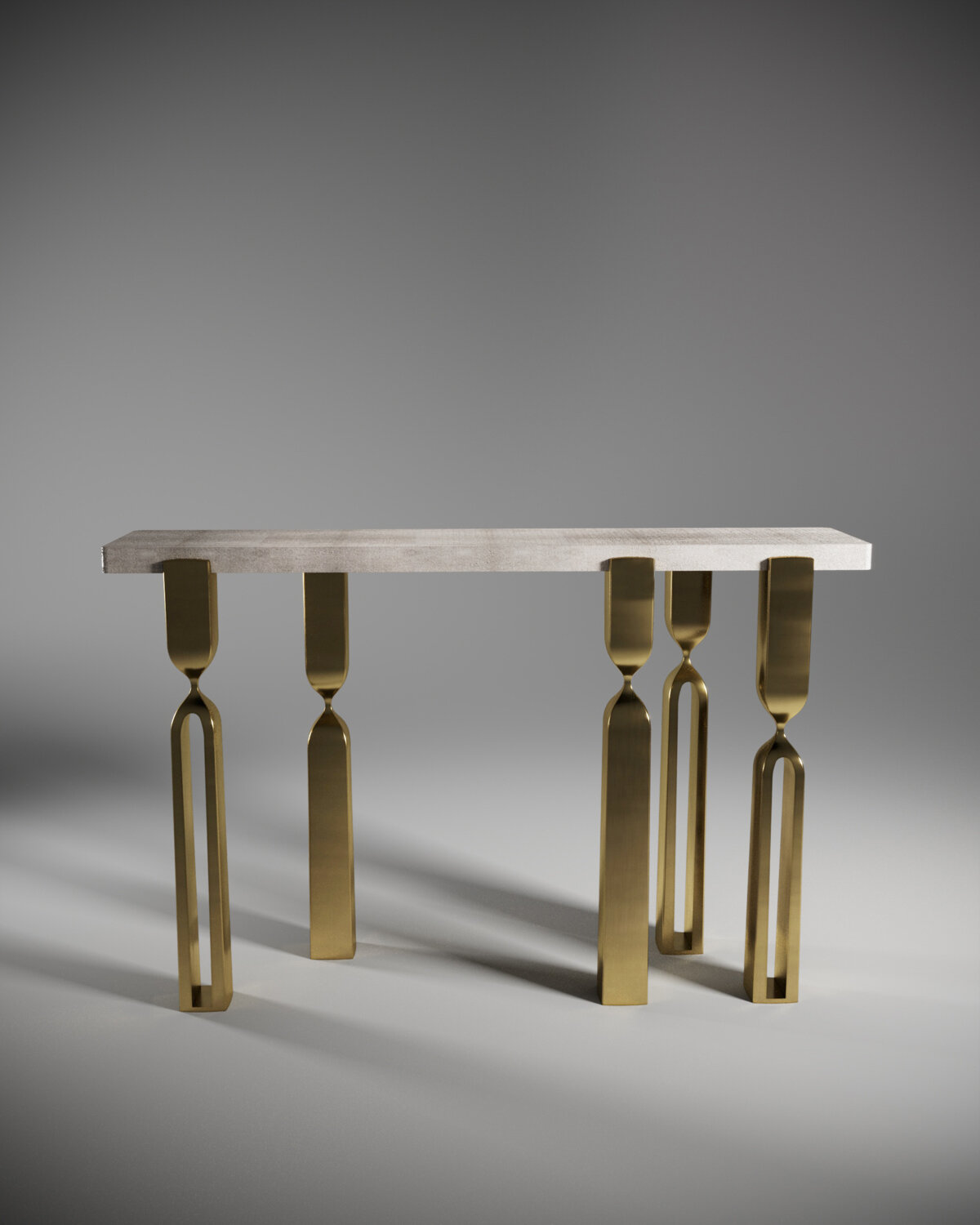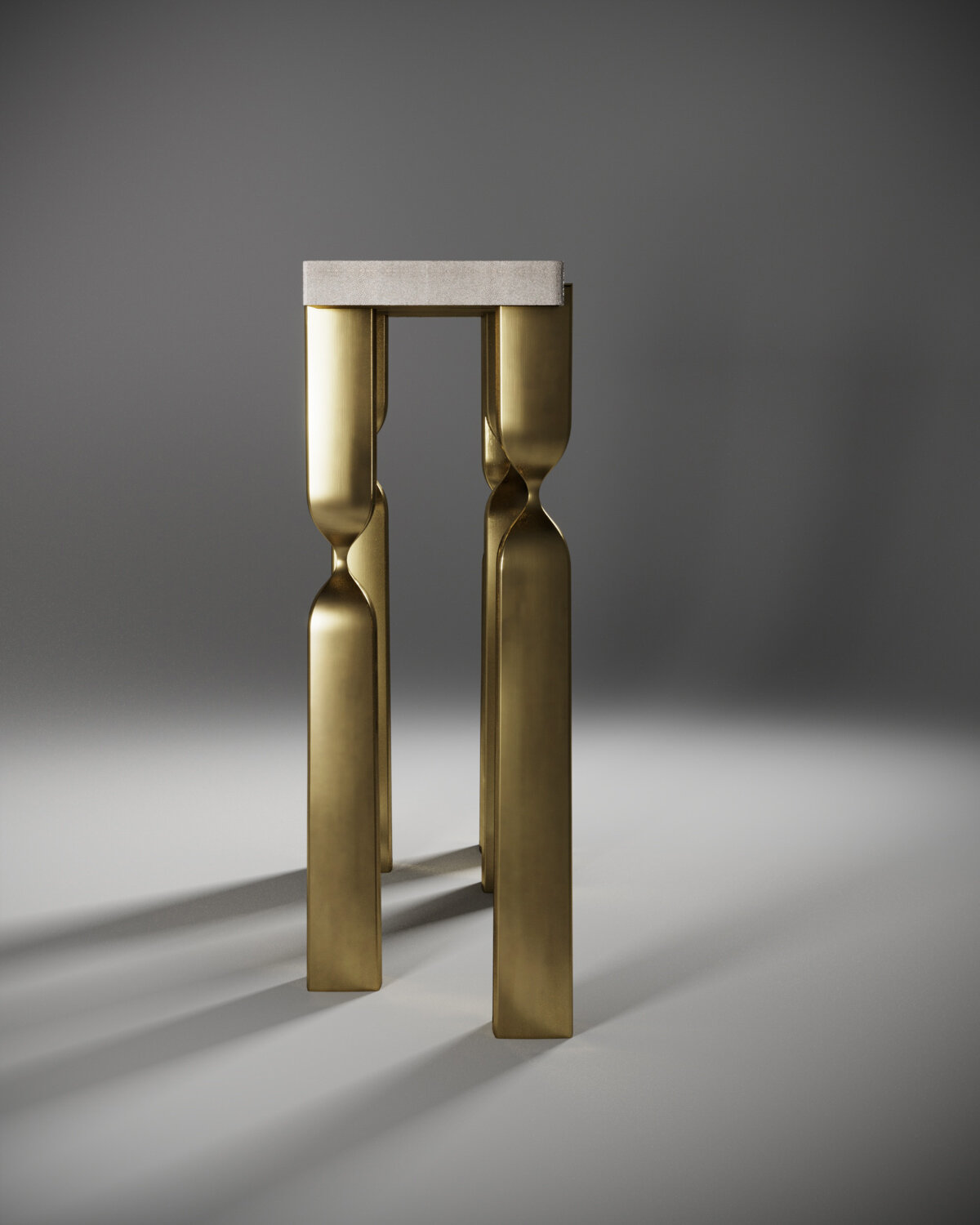 Inspired by the original Rhapsody lamp, by her fiancee Patrick Coard Paris, Kifu Paris designs a sculptural console as an ode to his iconic lighting collection. The console tabletop is inlaid in cream shagreen and sits on 5 bronze-patina brass "rhapsody" legs that are a mixture of solid and cut-out shapes. The legs clasp the side of the top creating another elegant detail. Available in other finishes.