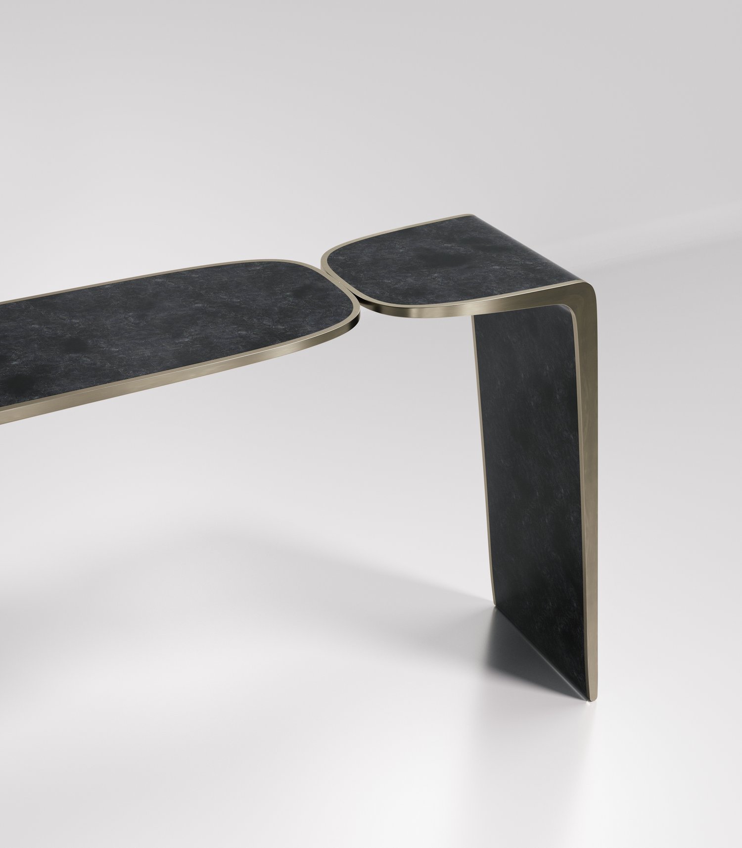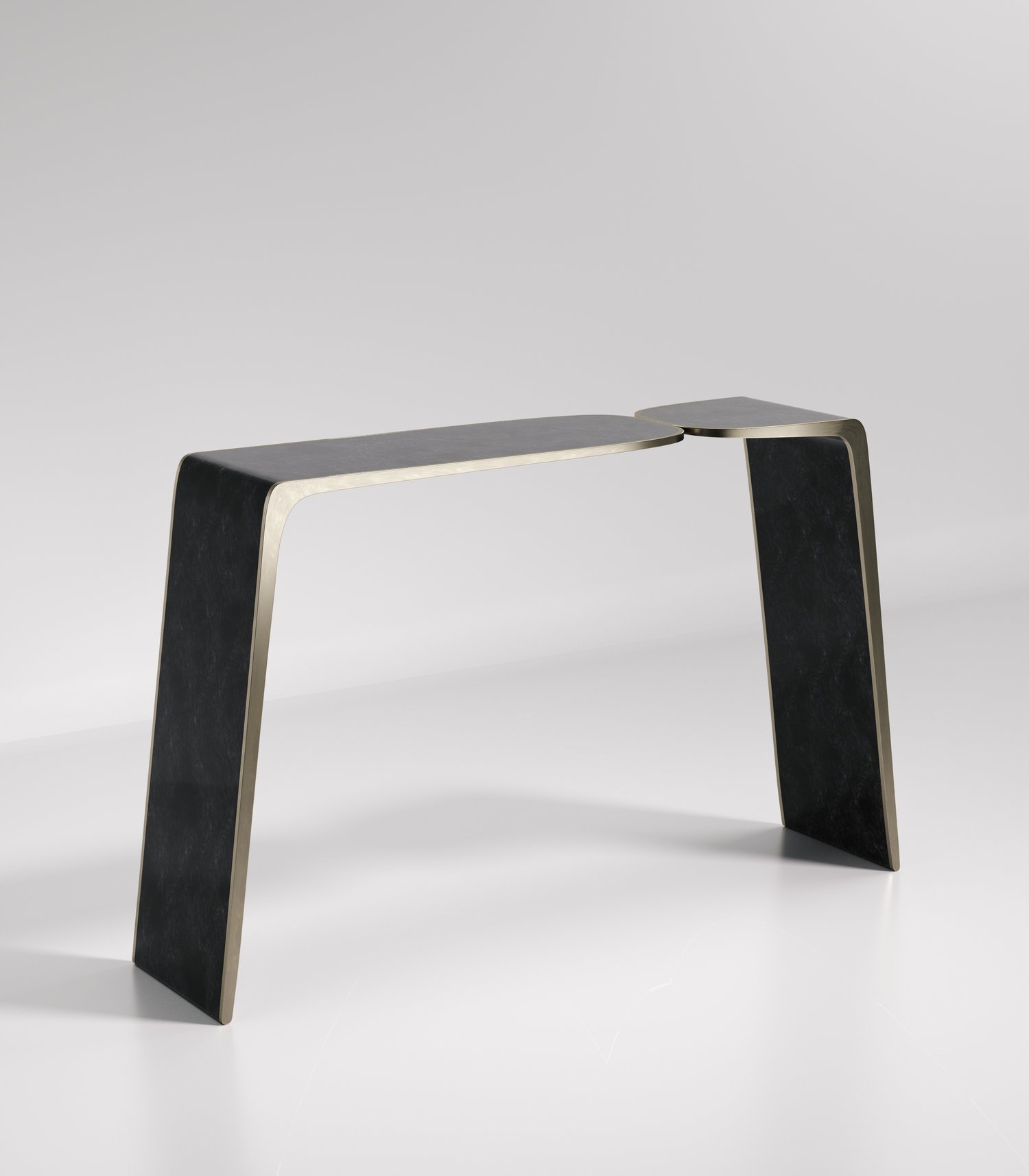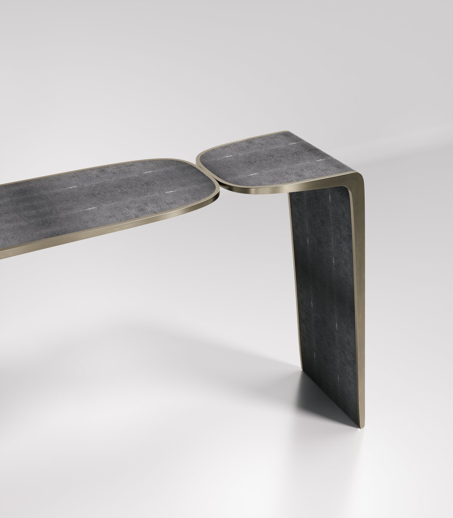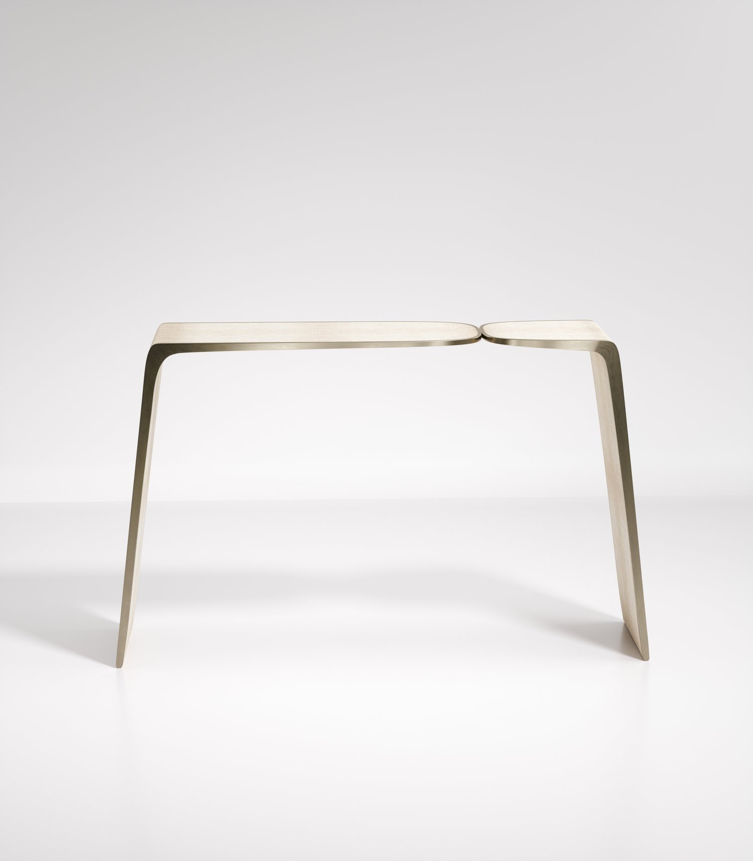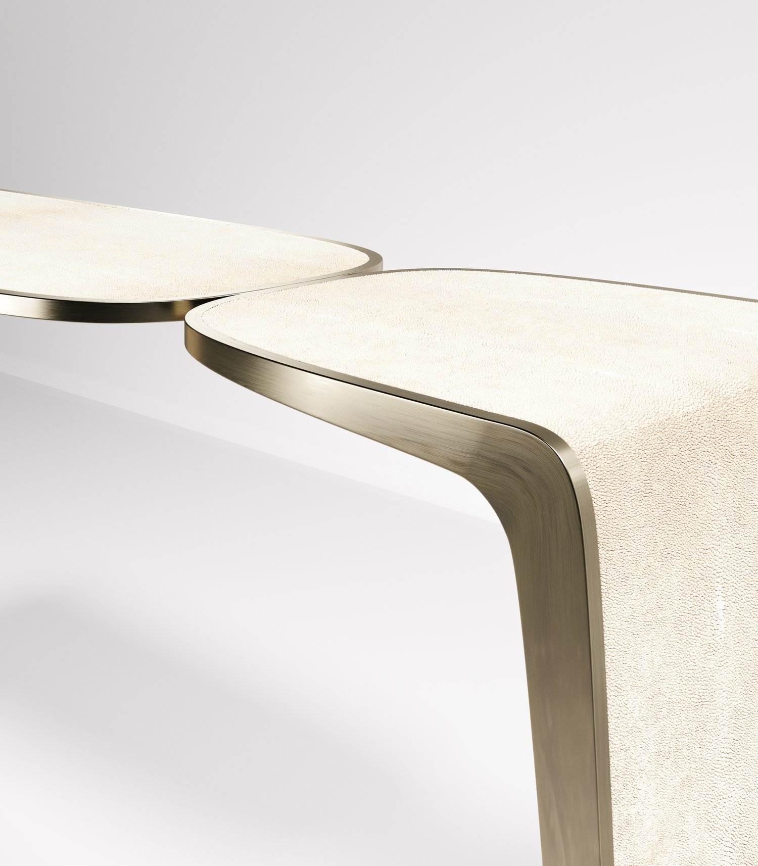 The Kiss Console by Kifu Paris is an elegant and organic piece in it's unique design. The cream shagreen inlaid piece curves inwards to create the "kiss" effect. The borders are accentuated by bronze-patina brass. This piece is designed by Kifu Augousti the daughter of Ria and Yiouri Augousti. Available in other finishes. Part of the Kiss Capsule.