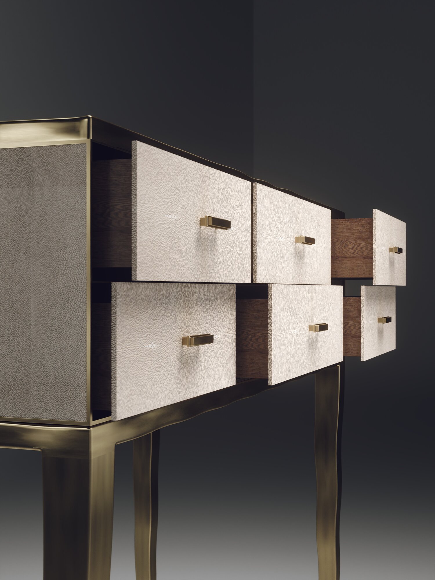 The Melting Cosima console table by R&Y Augousti is a stunning multi-faceted piece. The beautiful signature "melting" inlay work in bronze-patina brass demonstrates the incredible artisan work of Augousti. This piece includes 6 drawers total, and the tabletop is slightly dipped making this a great console for your entrance or vanity. This piece is inlaid in a mixture of patagonia and cream shagreen, available in other finishes. Custom sizing/finishing available on request.
