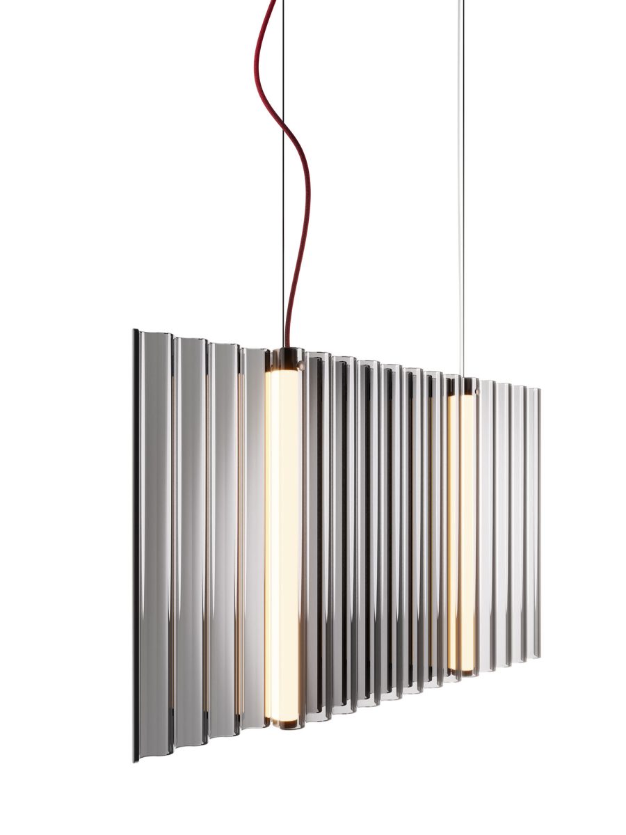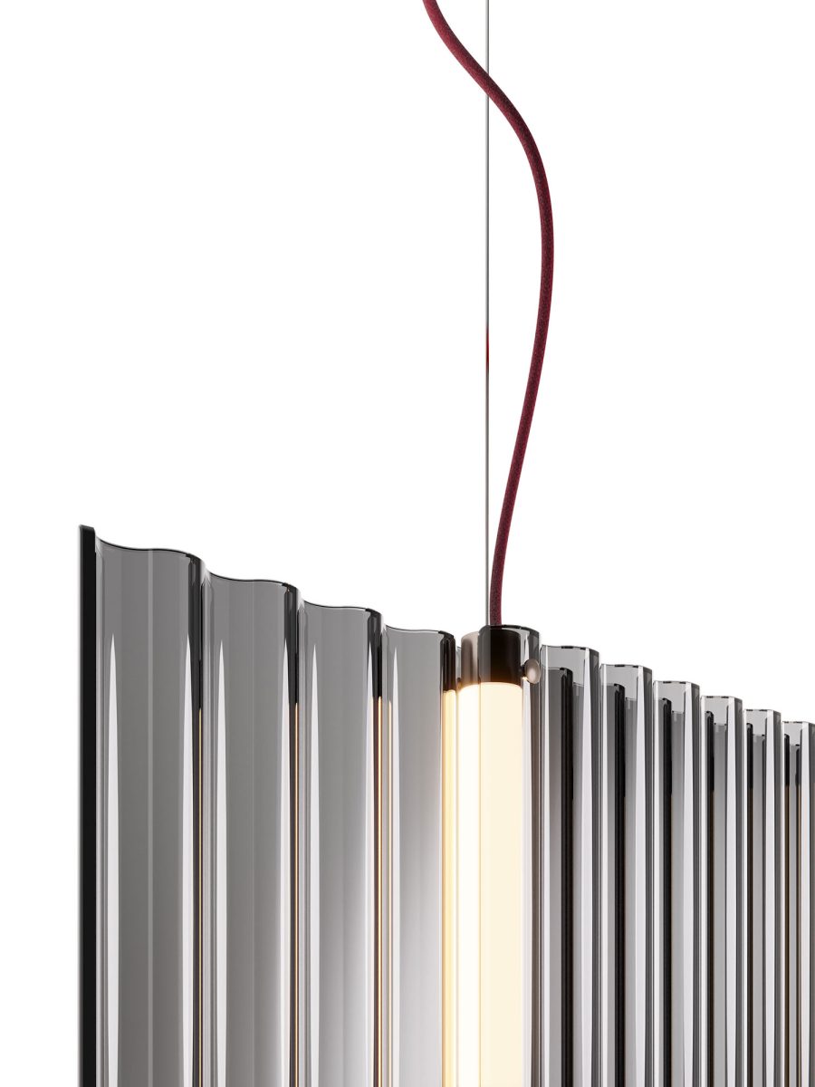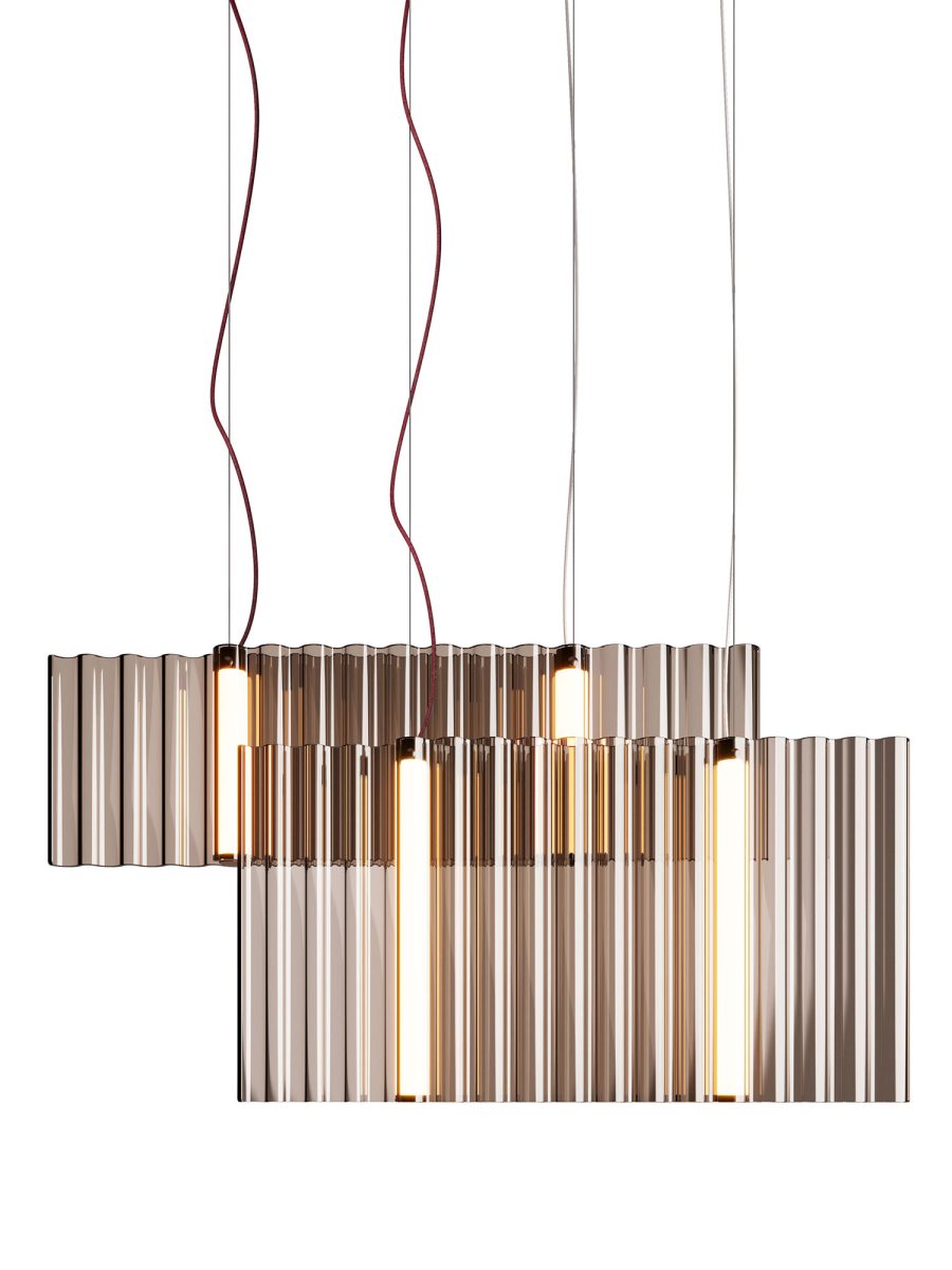 Lampada a sospensione per interni composta da due elementi in vetro da 6 mm fumè o bronzo fuso con motivo ondulato.