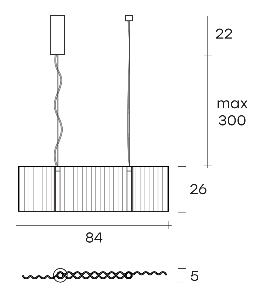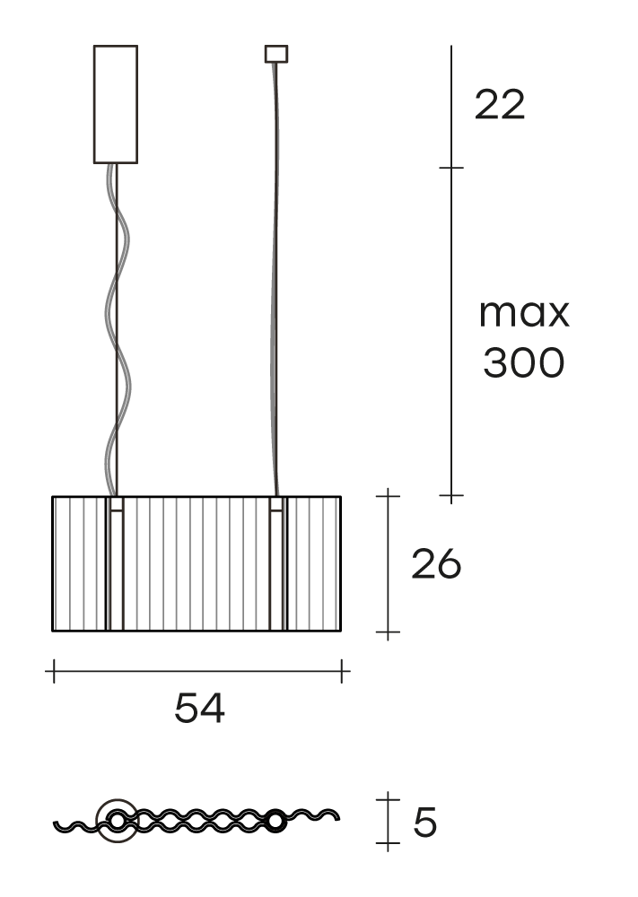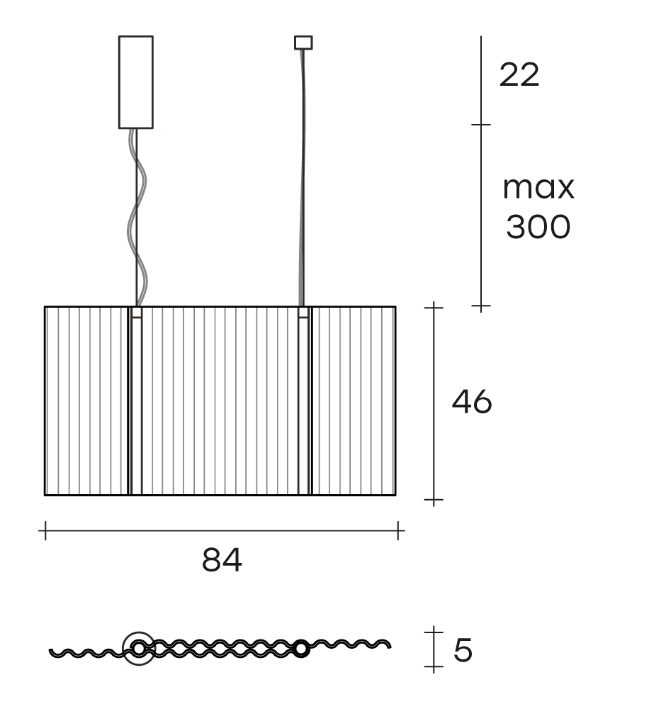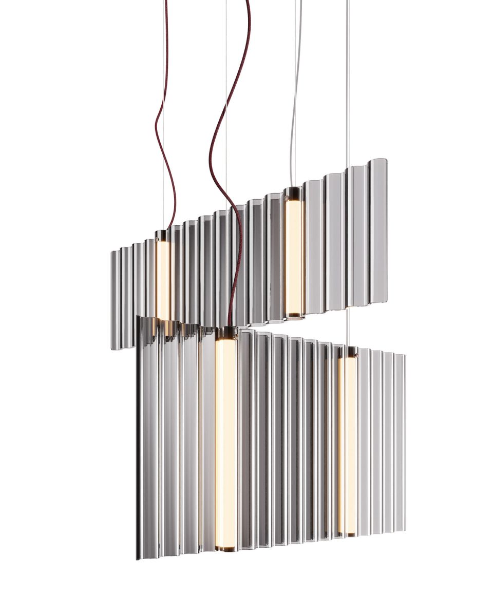 Lampada a sospensione per interni composta da due elementi in vetro da 6 mm fumè o bronzo fuso con motivo ondulato.