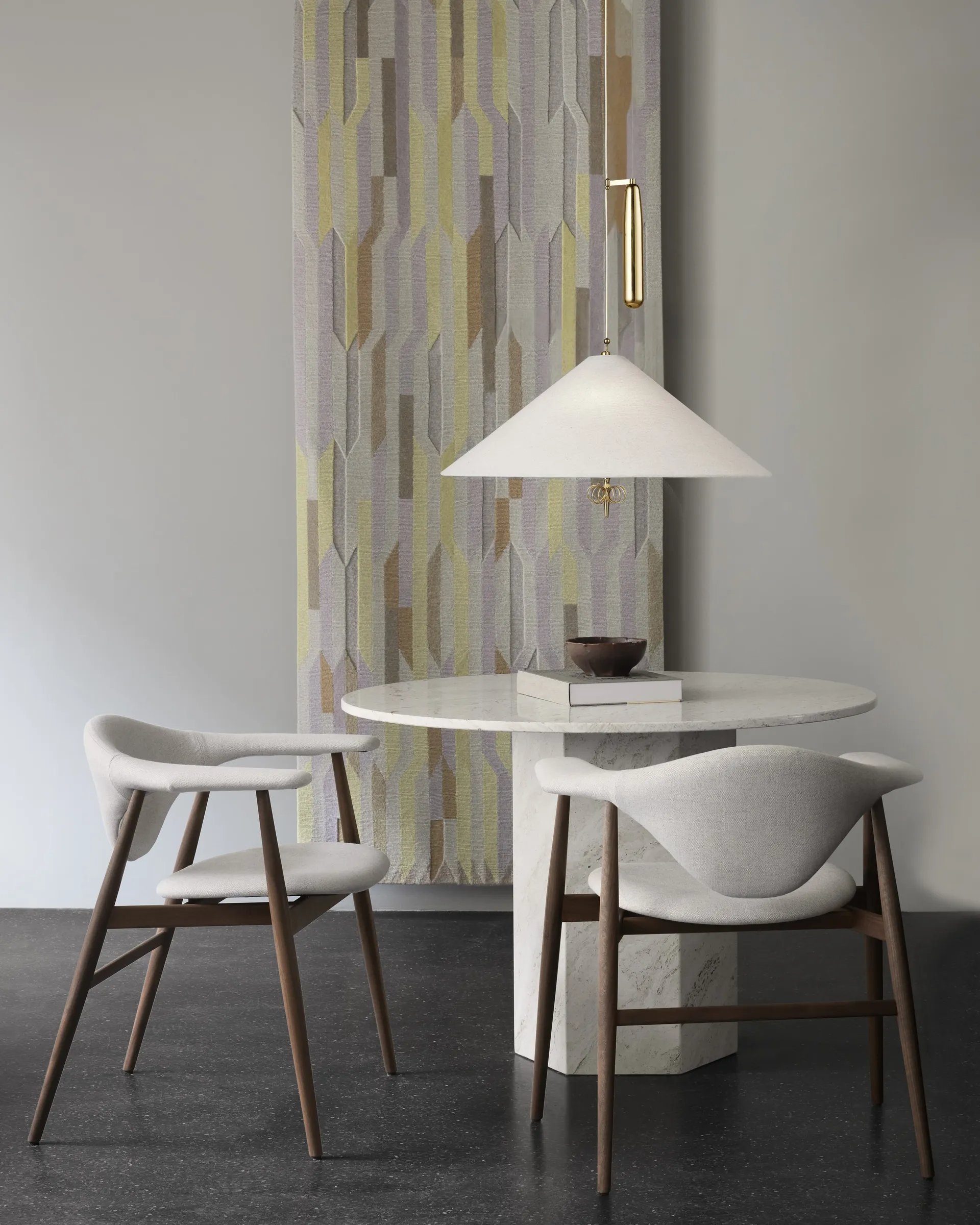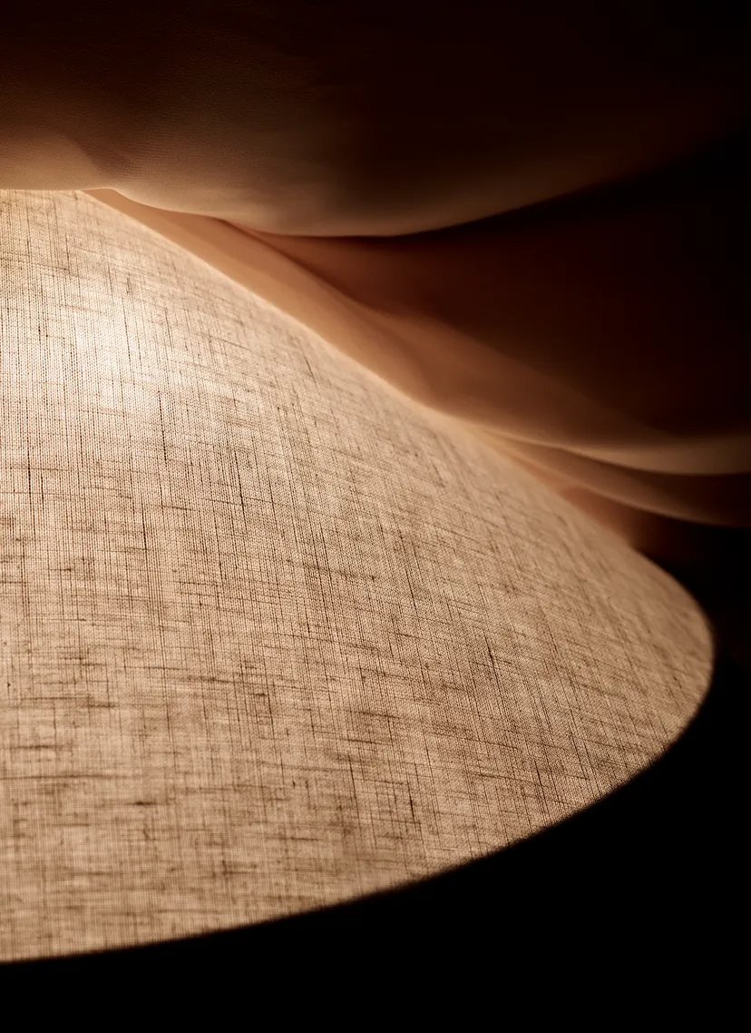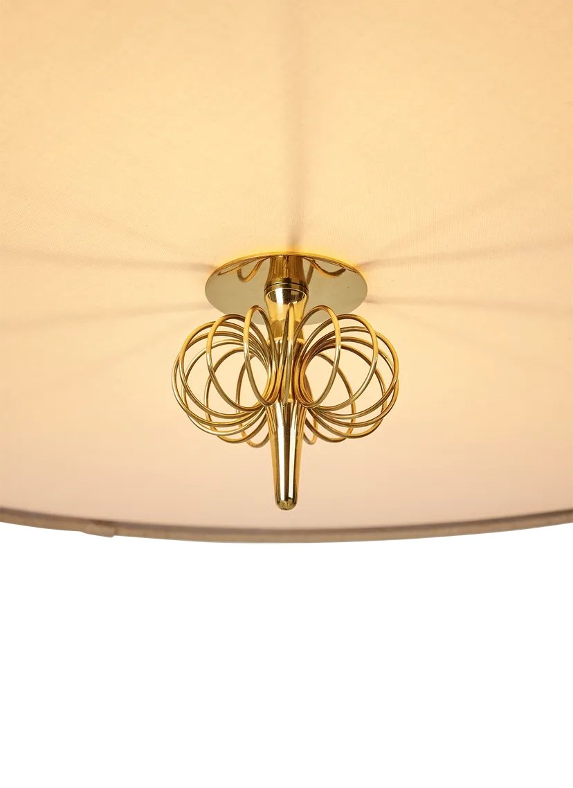 Known to many as ‘the man who illuminated Finland’, the legendary designer and met- alsmith Paavo Tynell is one of the leading lights of 20th-century industrial design . A classic 1950s Tynell design, the 1967 pendant expands on the design language developed in 1948 for the 1965 pendant. The 1967 is characterized by a conical canvas shade which exudes warm ambient light, with Tynell's signature brass hardware adding a subtle, premium expression. Below the bulb, a fabric diffuser modulates the light and, beneath this, a decorative brass detail gives each lamp a flourish of character, and subtly influences the play of light it generates.