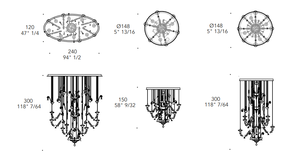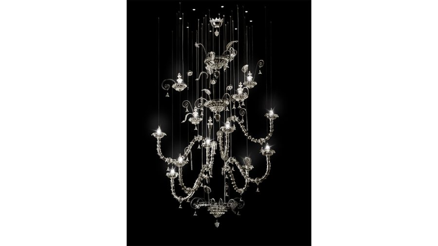 Lampadario in stile Ca' Rezzonico scomposto con led a rosone ed elementi pendenti illuminanti.