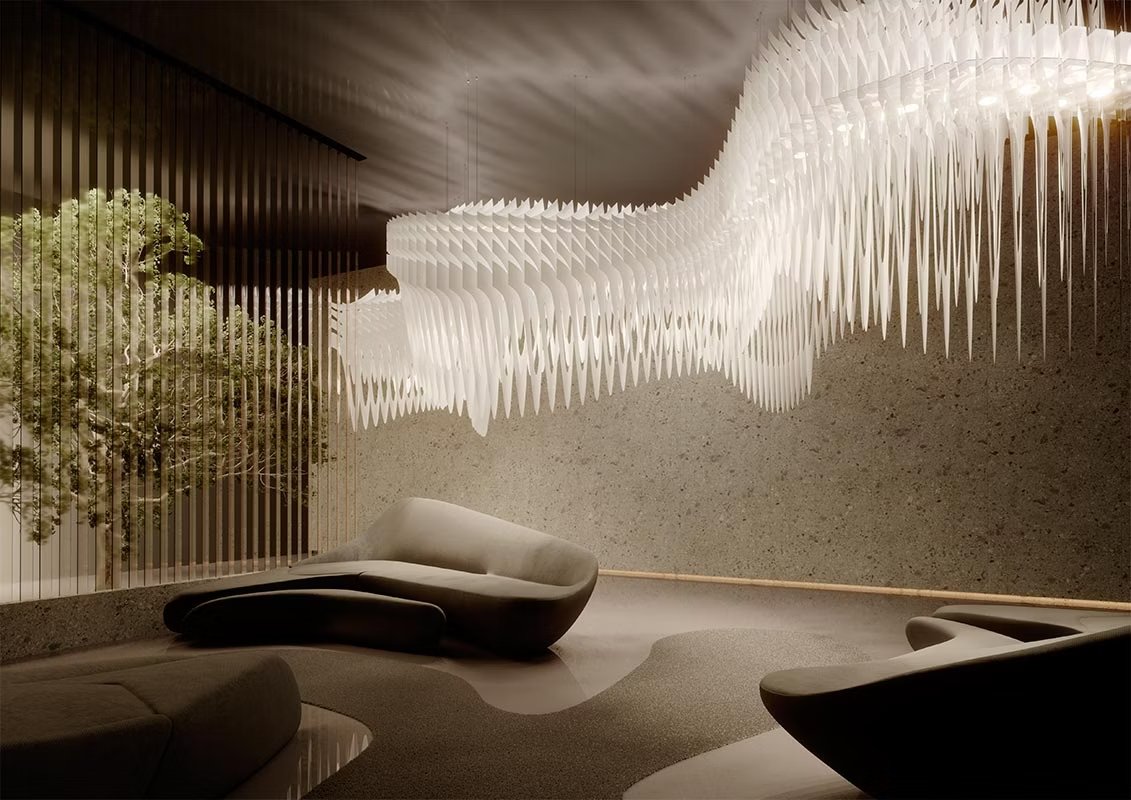 To celebrate the 10 year anniversary of Slamp’s collaboration with Hadid Design Studio, the iconic Aria takes on new form in a modular version. The illuminated system sinuously undulates throughout a space with diverse polycarbonate layers that create visionary fluidity, easily customized to fit any project.