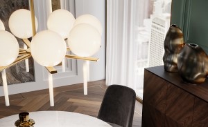 Le linee di questo lampadario rimandano a geometrie oltre il tempo, le sue ampolle in vetro scandiscono lo spazio con leggerezza ed eleganza. Grande ricercatezza dei materiali e della loro combinazione.