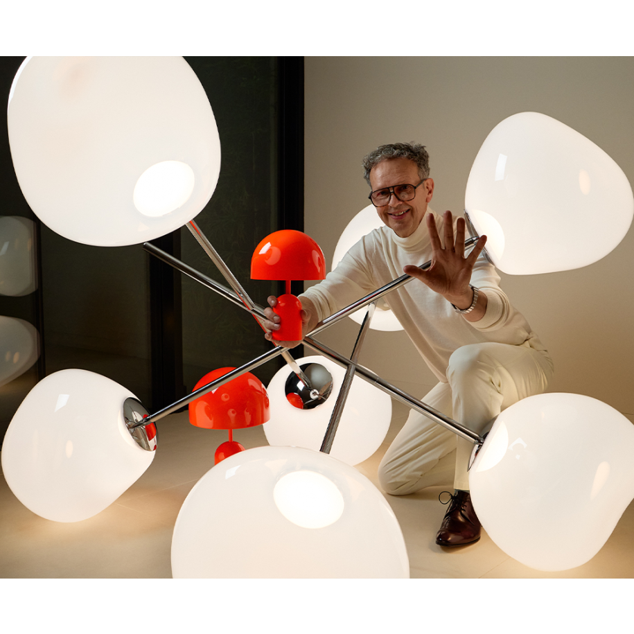 Obsessed with the idea of creating an imperfect, organic and naturalistic lighting object, Melt was created in collaboration with FRONT – a Swedish design collective. Melt is evocative of molten glass, the interior of a melting glacier, or images of deep space.