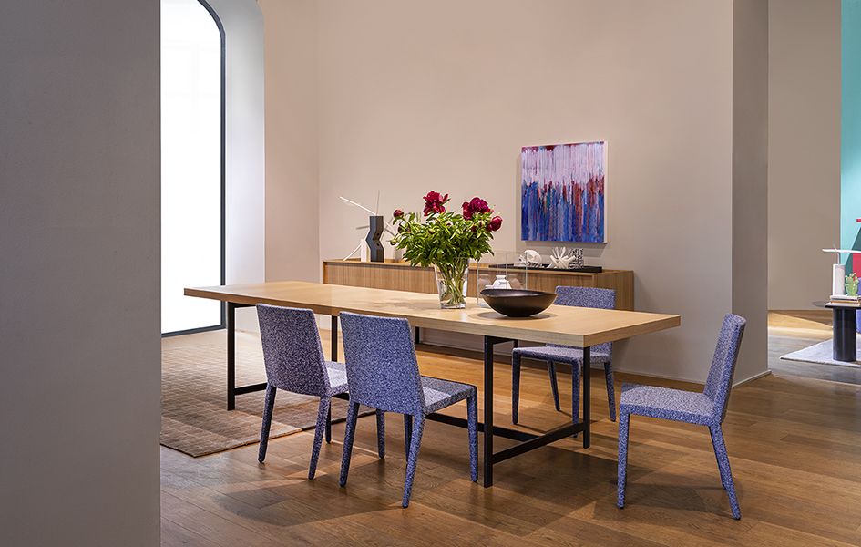 A delicate rose in full bloom is embroidered on the back of the Normal chair, by Studio Cappellini, a successful blend between rigour and romanticism. In this chair, the precision of the design is accompanied by a captivating aesthetic flair, embellished by a flourish of countless shades of pink and green. The Normal chair has a frame without armrests and is available in leather and “Stamskin Zen” ecoleather upholstery; also available without embroidery on the backrest.