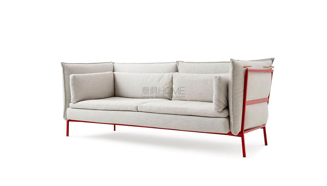 The Basket 011 sofa is supported by a matte varnished metal structure in white, red, anthracite or mud. The removable covering is available in the fabrics and leathers from the collection; the cushion covers can also be made combining different fabrics and leathers.