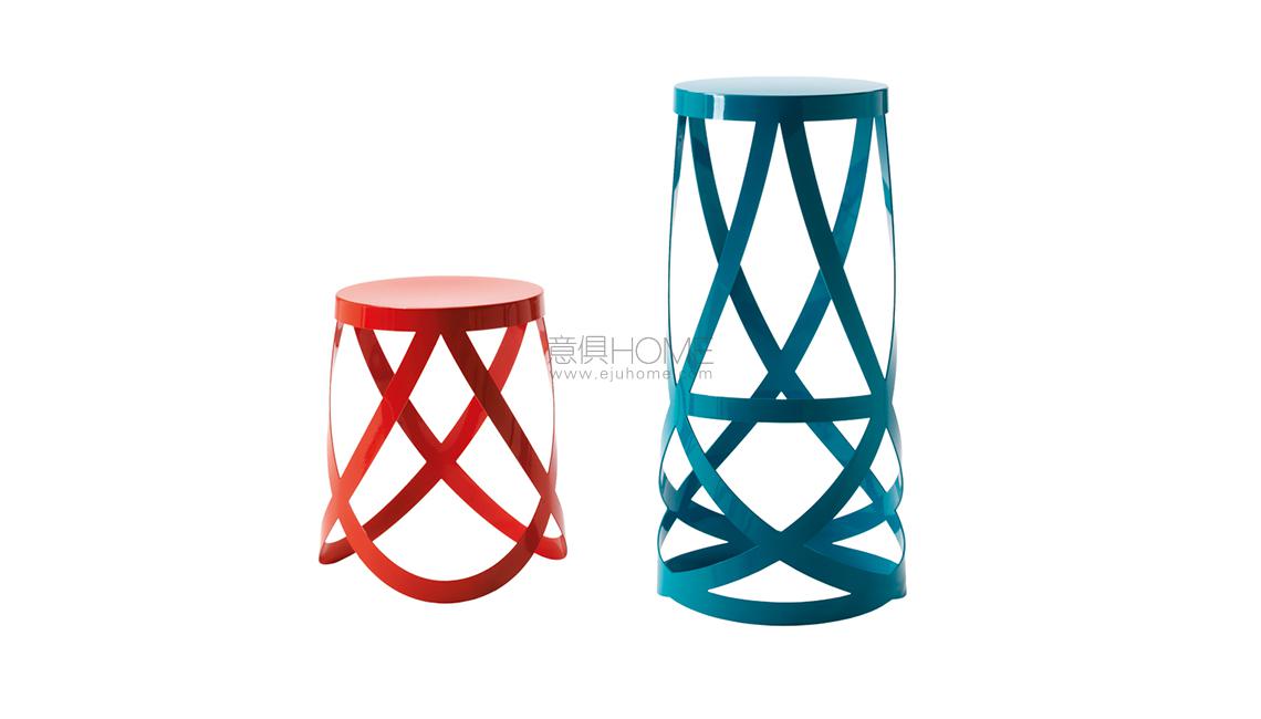 The Ribbon stool range includes high and low versions, available in matte lacquered finish in white, red, anthracite and mud. For added comfort, the seat can also be equipped with a magnetic cushion, padded with polyurethane foam and covered in a selection of leathers and fabrics from the collection.