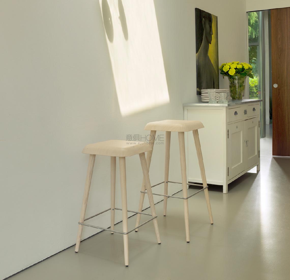 The base of the Daddy Longlegs stool is available in ash wood with a bleached, black-stained or wengé finish, or stained with Shanghai blue aniline.