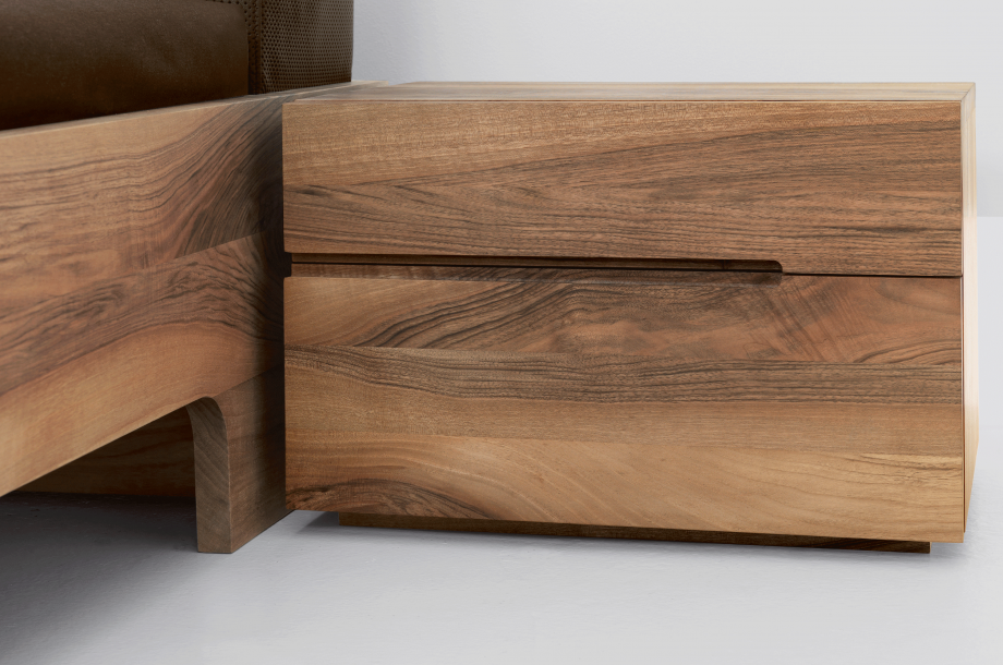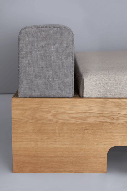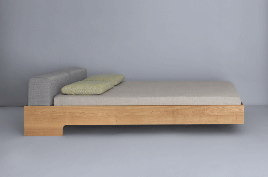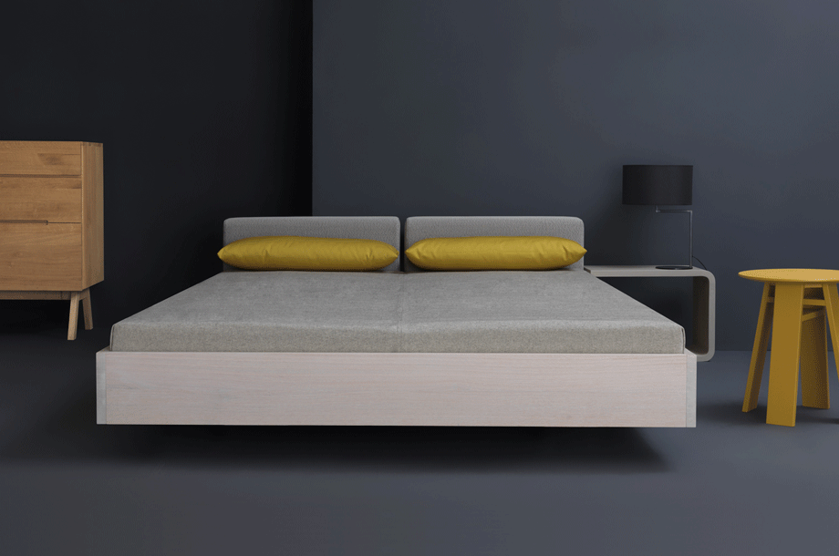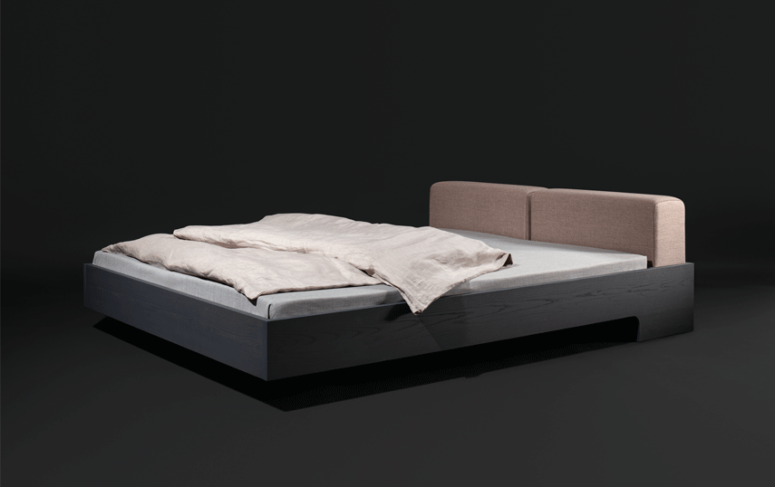 DOZE – with its floating grace is more than just a bed. It‘s an invitation to linger. Comfortable padded cushions makes the bed very adaptable, available in fabric and leather. A storage room with shelves is hiding underneath.