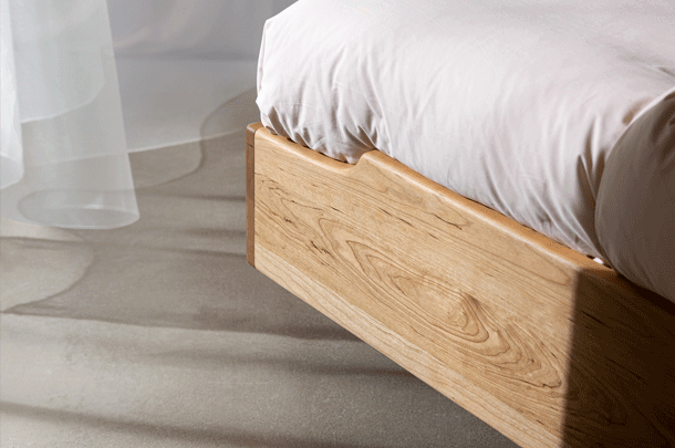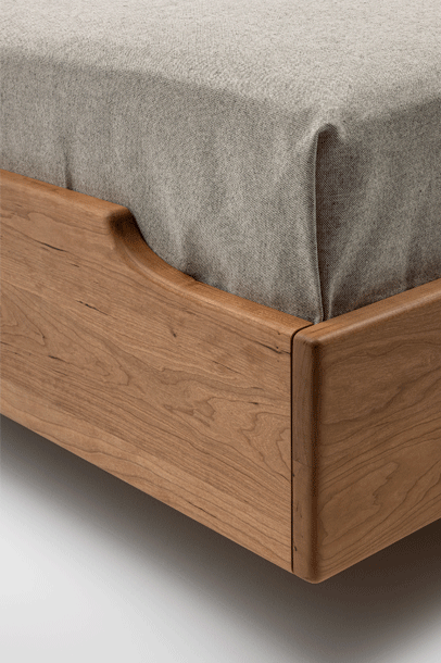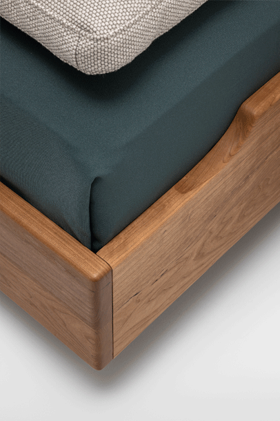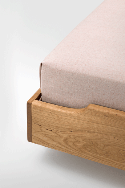 ECLAIR PETIT Bold – the bed with soft contours. The bed is characterised by its concise outer contours. The minimalist frame construction encompasses the mattress on top. The foot section rises with a swing – a gesture like an embrace that offers security and support. The soft, consistently surrounding edge radius condenses the quality and beauty of the solid wood.