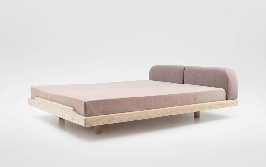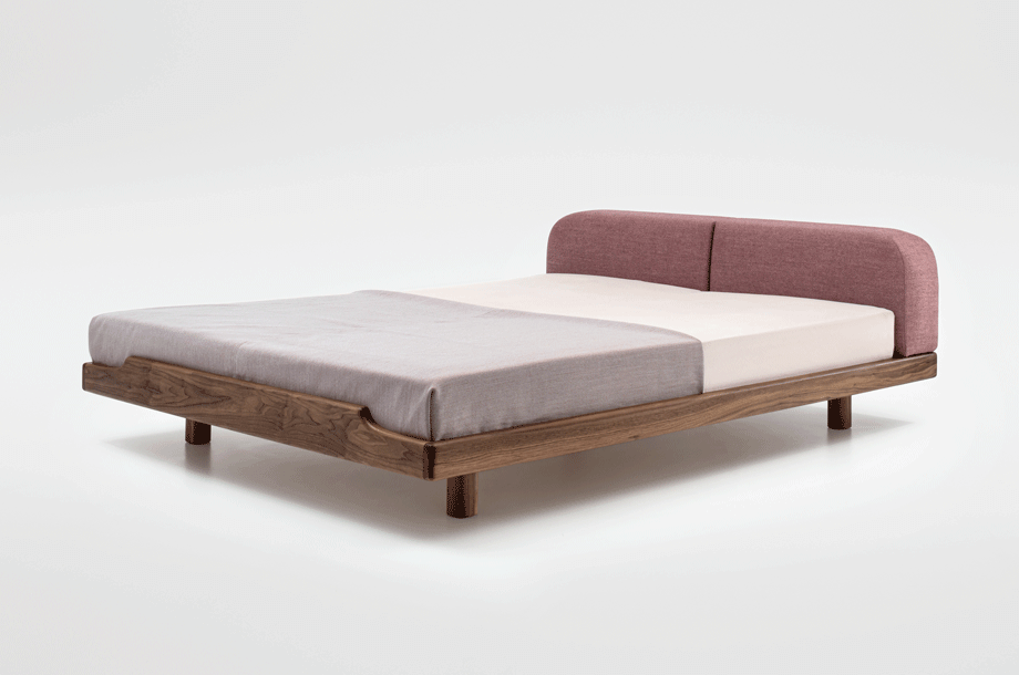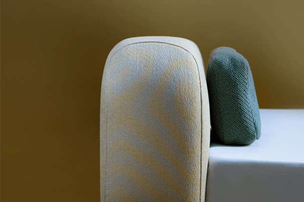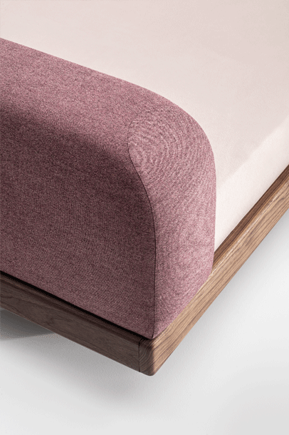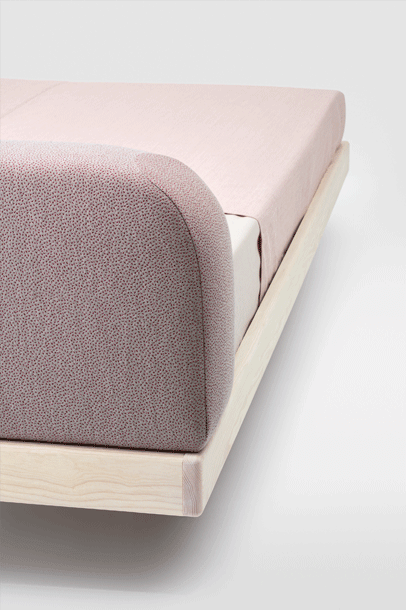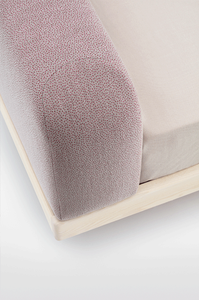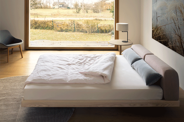 The pleasant feel creates a tangible softness. The comfortable upholstered cushions function as a headrest for reading while lying down or as a dimensionally stable backrest when sitting upright. The rounded cushions and their clearly differentiated seam pattern form a closed overall picture with the reduced bed frame.