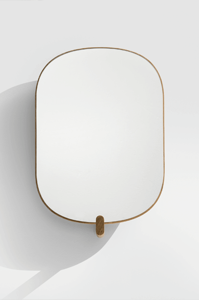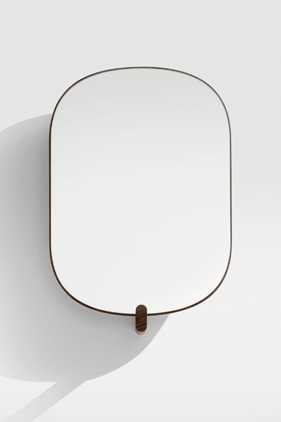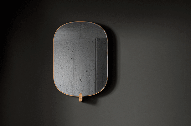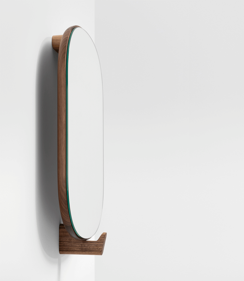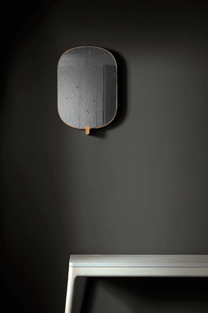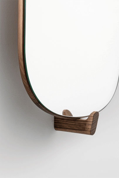 AD ORE – the mirror with hook. A hallway mirror for the last glimpse before leaving and a welcoming hand upon arrival. AD ORE does not only offer time for reflection, it also adds a coat hook to the structure holding the frame in place. An opportunity to hang a favourite jacket or the prepared bag that should not be forgotten.