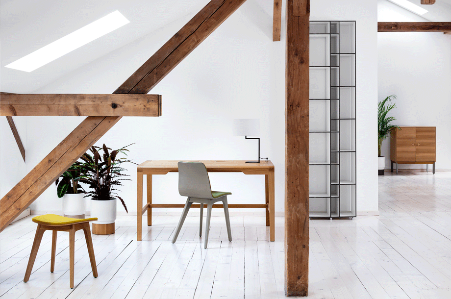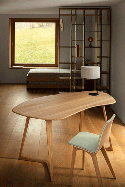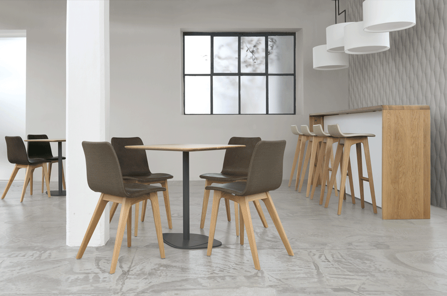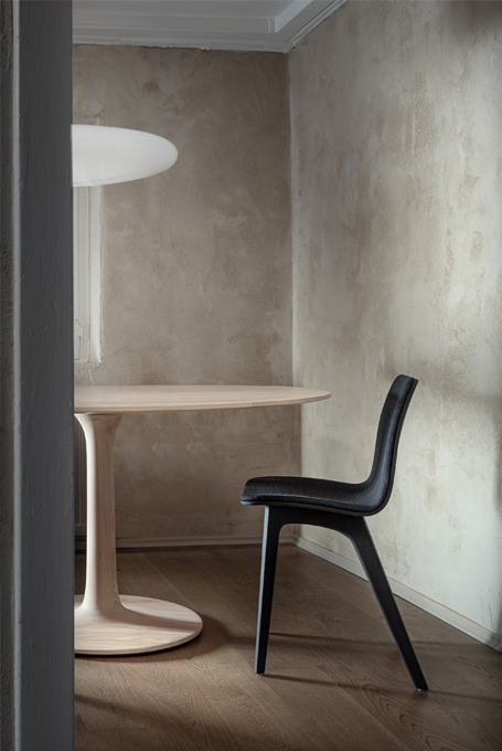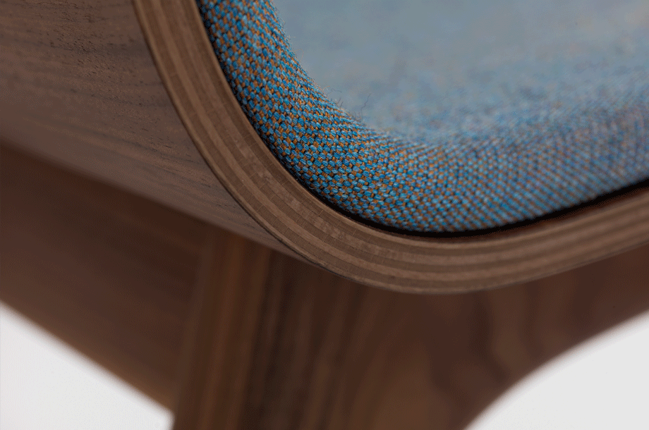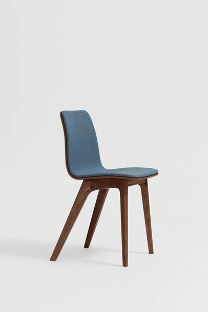 The positioning of the legs gives the chair MORPH a unique posture, as if it had a support and a free leg. The sculpturally formed sub-frame conveys the interplay between stability and dynamism. Due to its delicate appearance this straightforward chair exudes an air of lightness that requires only a small area. The solid wood frame carries a light molded veneered wood shell, optionally with padded seat, or a fully upholstered shell.
