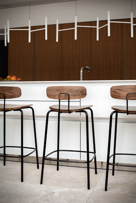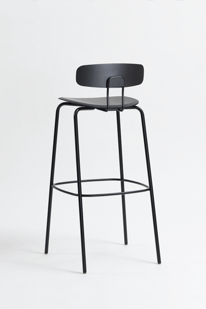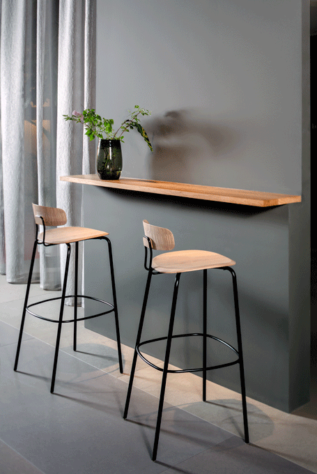 OKITO BAR – aesthetic material connection of tubular steel and solid wood. OKITO BAR is available in two seating heights, height 65 cm and 80 cm.The heart of this minimalist chair is the solid wood seat. With its CNC-milled form, the solid wood seat anchors the frame and backrest. The brackets are simply bolted to the underside and are not visible from above. In addition to the ergonomically shaped solid wood seat and backrest, the double bar of the backrest contributes to the special seating comfort of the chair.