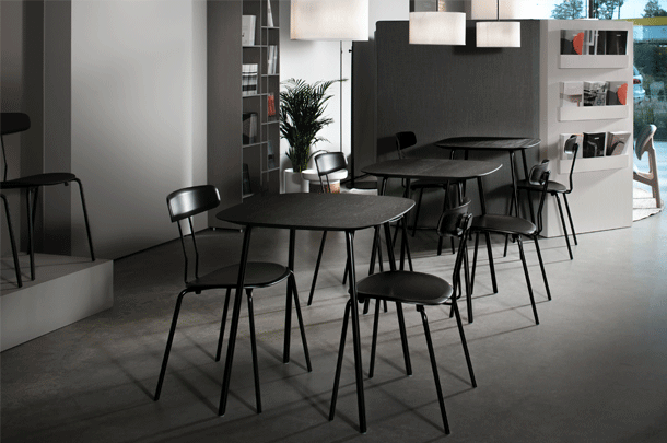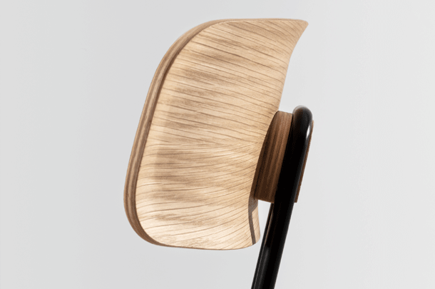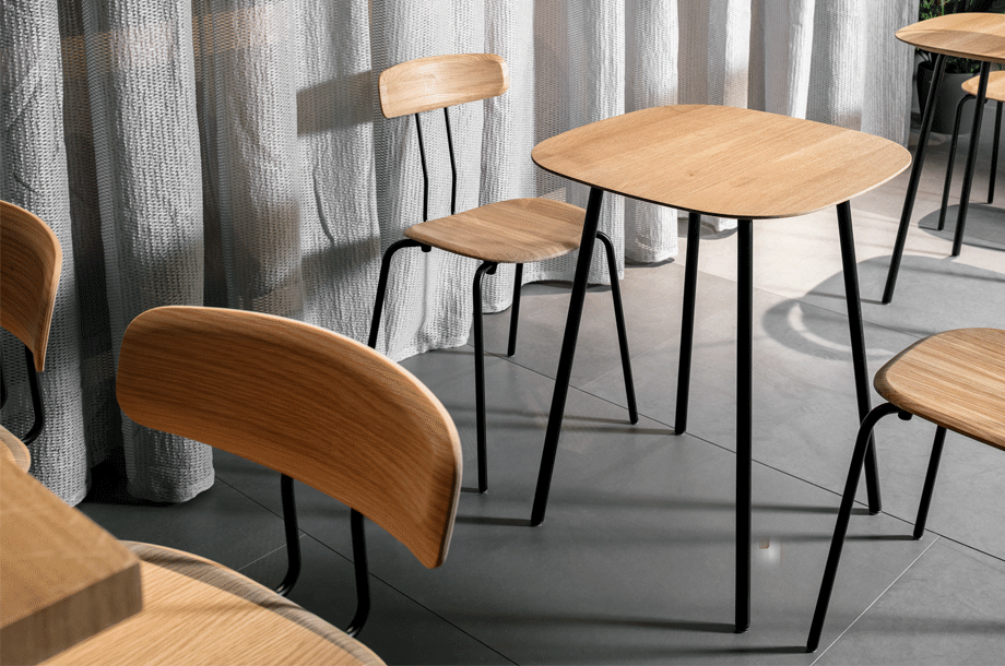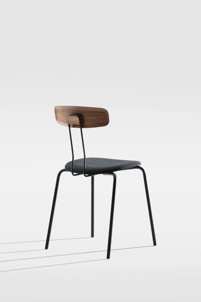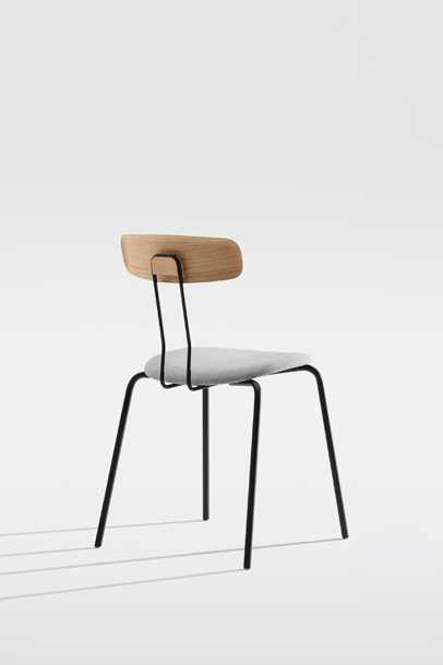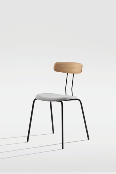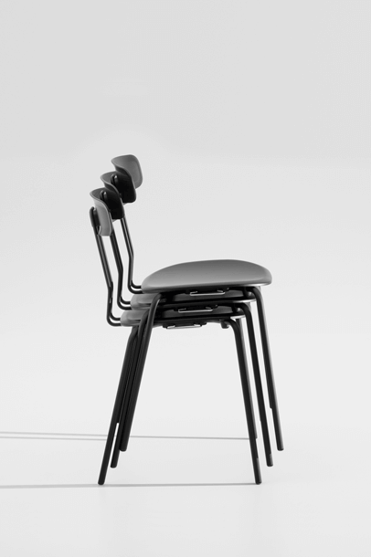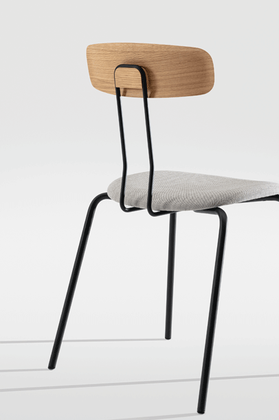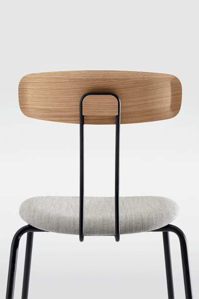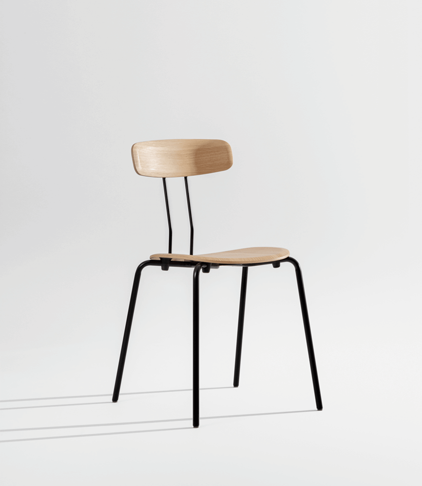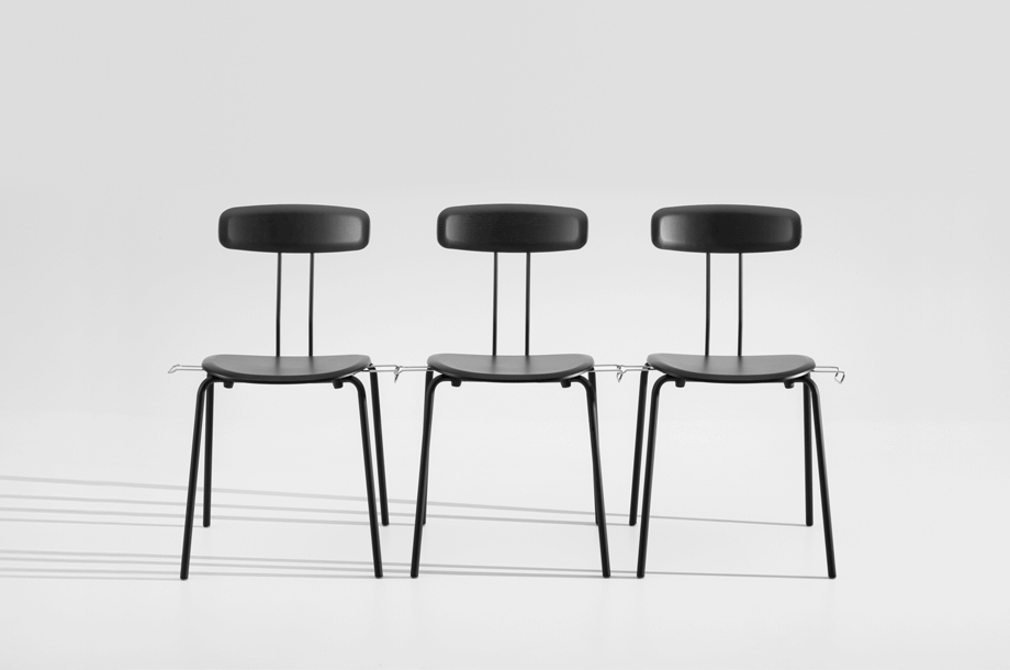 The double bar, which supports the backrest and represents the most striking detail of the minimalist design, absorbs the movement of the body and resonates with it. Together with the ergonomic shaped wood elements, this creates a high level of seating comfort with plenty of room for movement. Whether individually or in series, OKITO PLY offers versatile possibilities for object seating of restaurants, libraries and lecture halls. The chairs are connected with the optional row connector, the center distance is 53 cm.