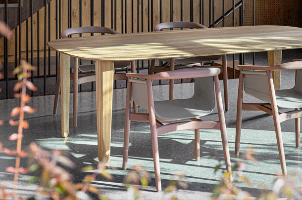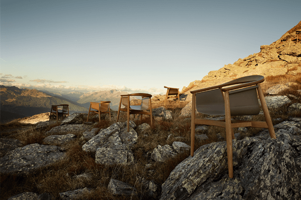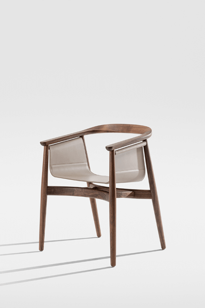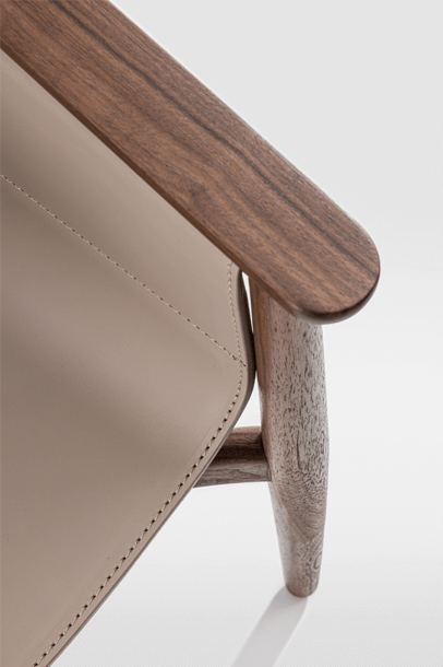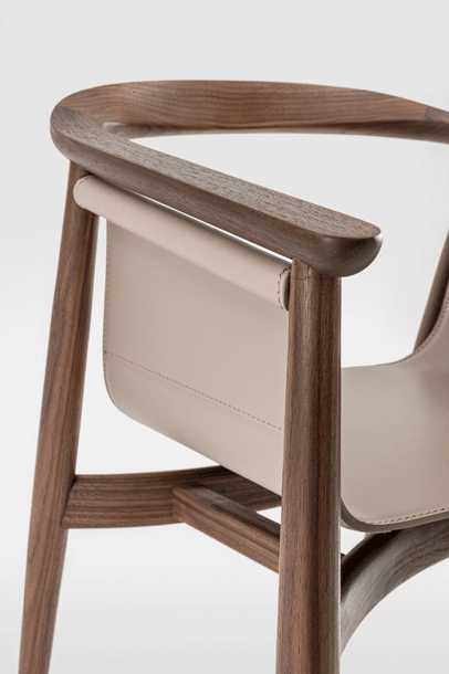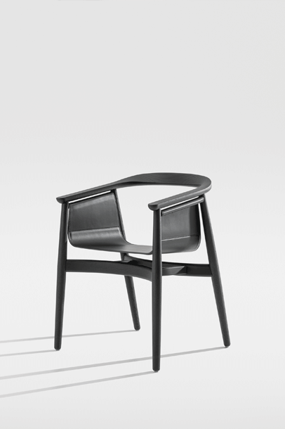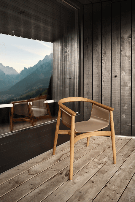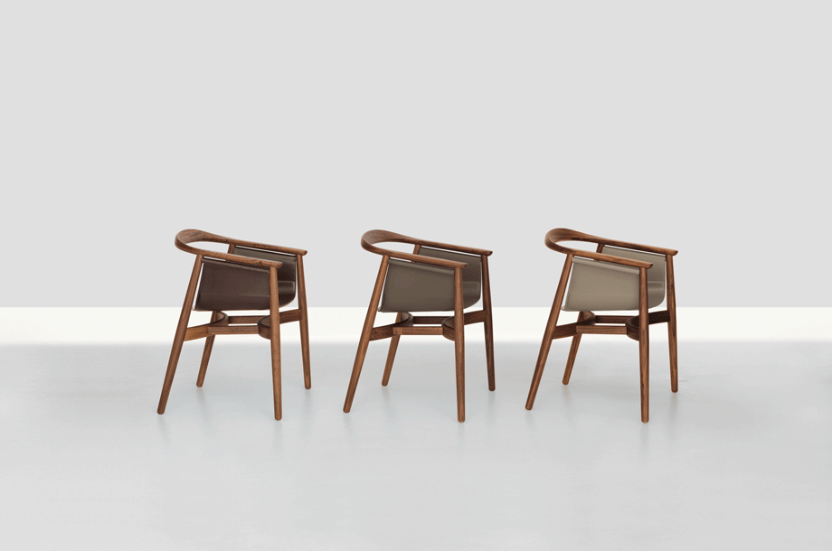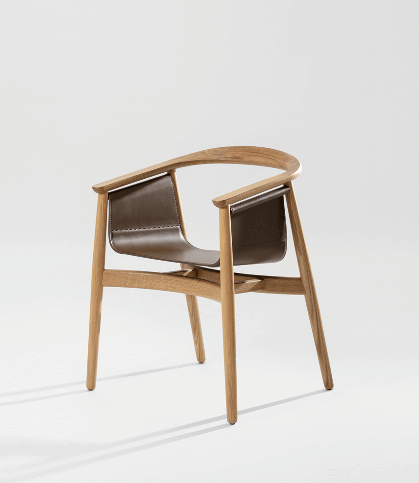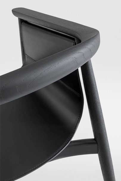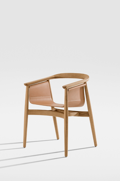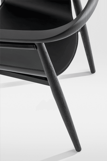 PELLE looks elegant and spacious, its semi-circular back and arm rest reflect the design language of Scandinavian classics. The special thing about PELLE is its freely hanging seat. It is held by a round strut that runs below the backrest. The roundwood holds the seat made of sleek leather.The incorporated aluminum insert forms the seat. In design terms, the merging back and arm rest is its standout feature. PELLE is suitable as a solitaire at the desk and in a group around the table.