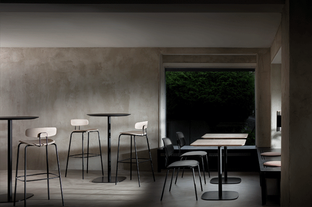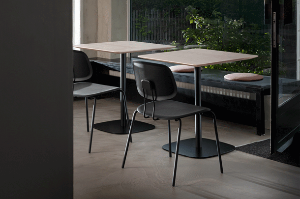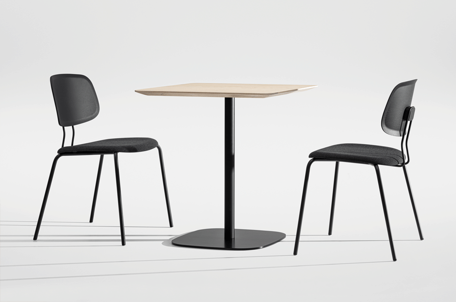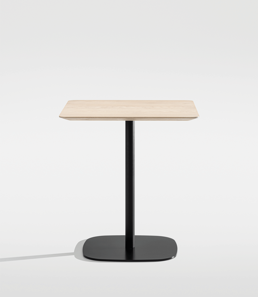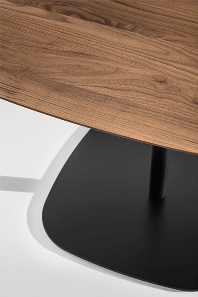 VERMU is characterised by its stable stand. The reduced, square base plate with its rounded corners can be combined with all tabletop shapes –whether round, square, rectangular or convex. The central, slender central foot ensures maximum legroom, the solid iron footplate ensures stable standing. The satin-matt powder-coated surface also ensures high durability in the building. The solid wood table top has a light and elegant appearance due to its profiled edge.
