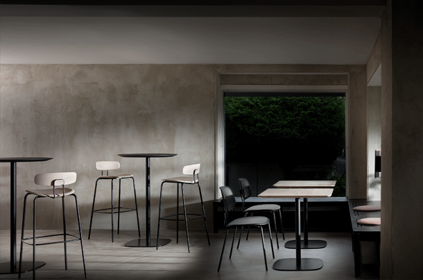 VERMU HIGH is characterised by its stable pillar frame. The reduced, square base plate with its rounded corners can be combined with both table top shapes – round and square. The slender central pillar ensures maximum legroom, the solid iron footplate ensures stablility. The satin-matt powder-coated surface also ensures high durability in contract use. With its profiled edge, the solid wood tabletop has a light and elegant appearance. Due to the reduced design language, the VERMU HIGH tables can be easily combined with all ZEITRAUM chairs.
