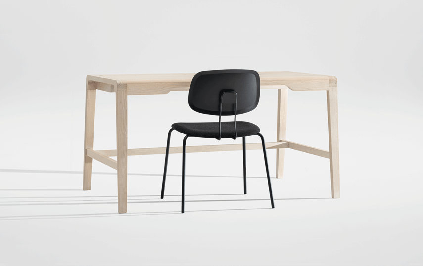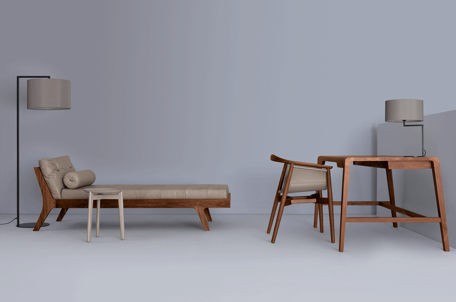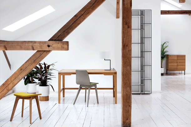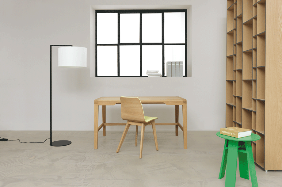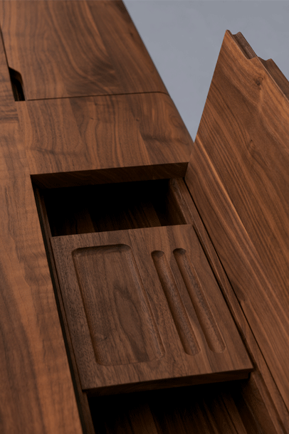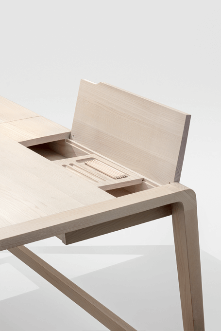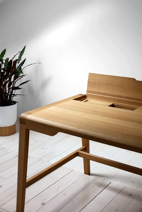 The secretary desk SECRET takes its cue from the familiar image of traditional school desks. Its appearance breathes self reliance, elegance and value. Although its cross sections are finely measured the secretary desks stretched out legs stabilize the desk. The two upfolding compartment covers conceal the integrated stowage compartment for writing utensils and a small laptop or tablet plus power cord.