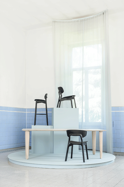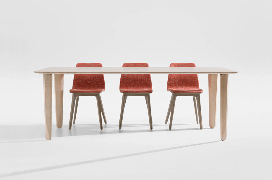 KUYU DINE – cut diamonds from solid wood. Inspired by and abstracted from African masks, precision cut table legs have been created to carry the table top. The cut diamonds of solid wood appear sculpturally powerful and at the same time seem to float. You can choose from three tabletop shapes: Circle, rectangle and convex rectangle.