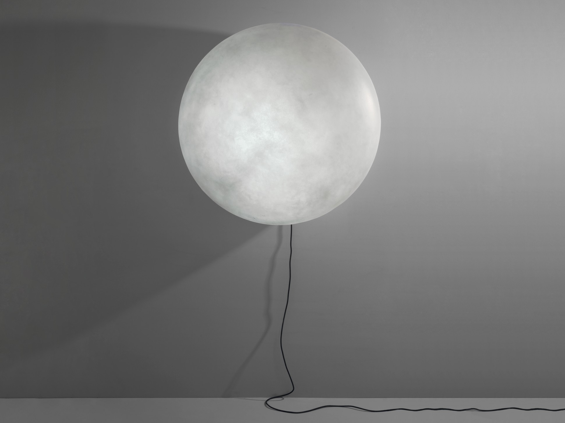 Una lampada che, come una luna alta in cielo o riflessa nelle acque, è capace di creare un caldo punto luce, sia fissata al muro che appoggiata al suolo. Il suo fil rouge la segue e la alimenta, facendole illuminare la stanza di un chiarore sfumato e avvolgente.