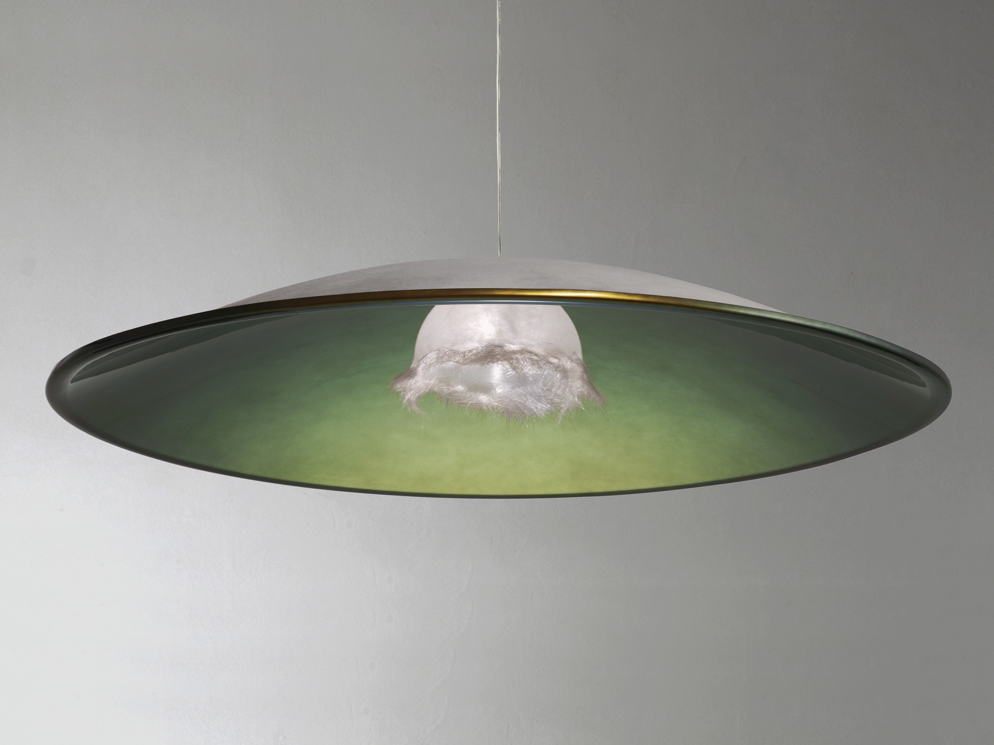 Una lampada a sospensione che nasconde una gemma attorno alla sorgente della sua luce. Un fiore di vetroresina lavorata finemente, che sembra in procinto di sbocciare, regalando a questa creazione contemporanea un tocco di inaspettata poesia.