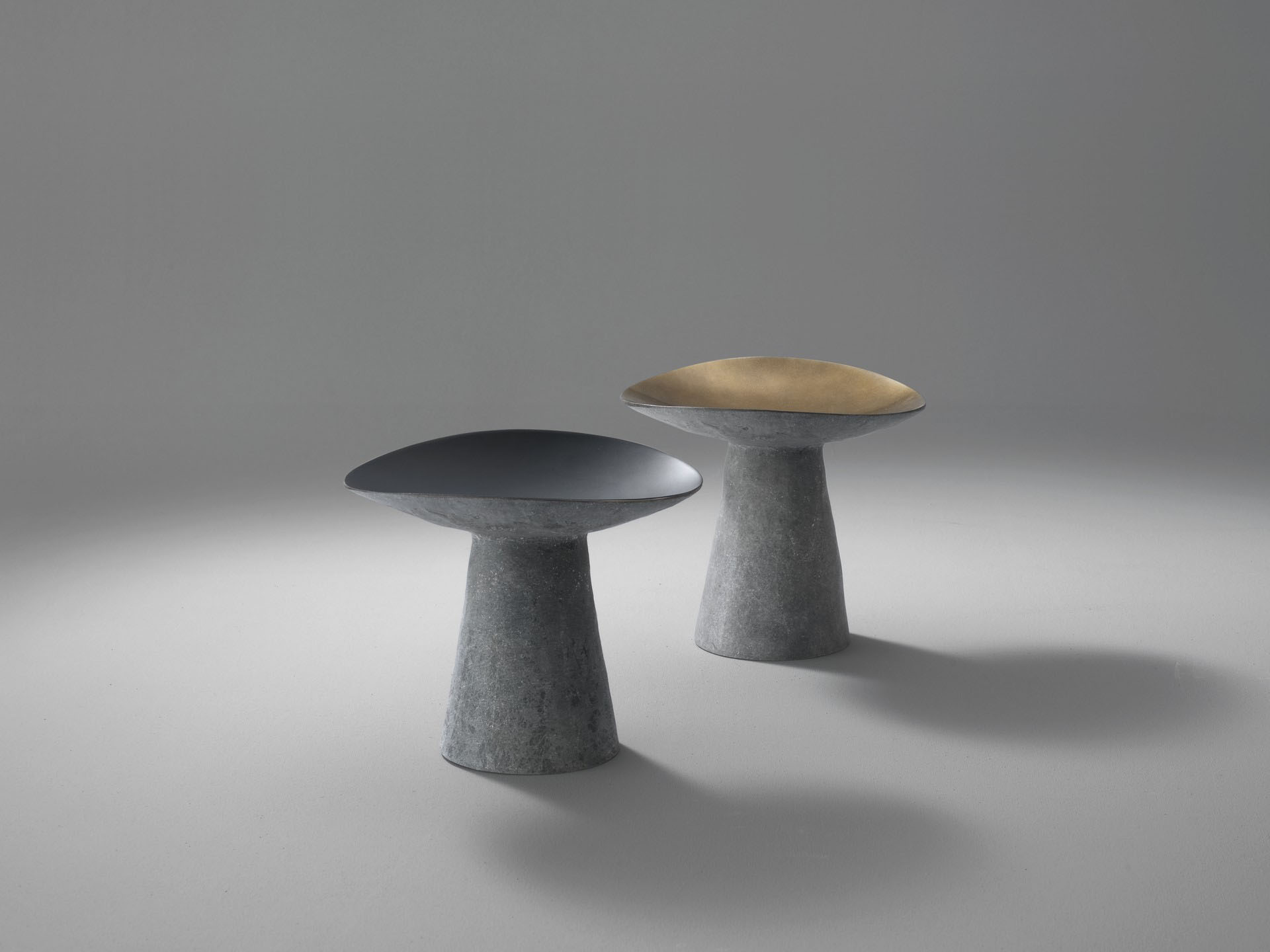 Alzate in vetroresina che colpiscono lo sguardo, glorificando l’oggetto che sorreggono o regalando, da sole, un nuovo movimento alla superficie su cui poggiano.