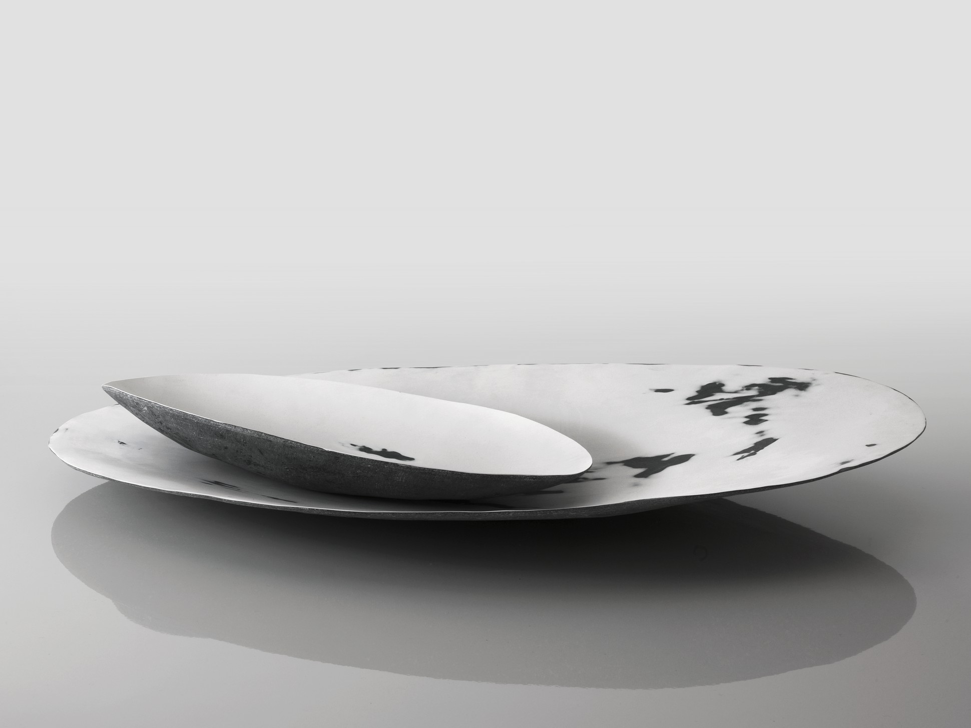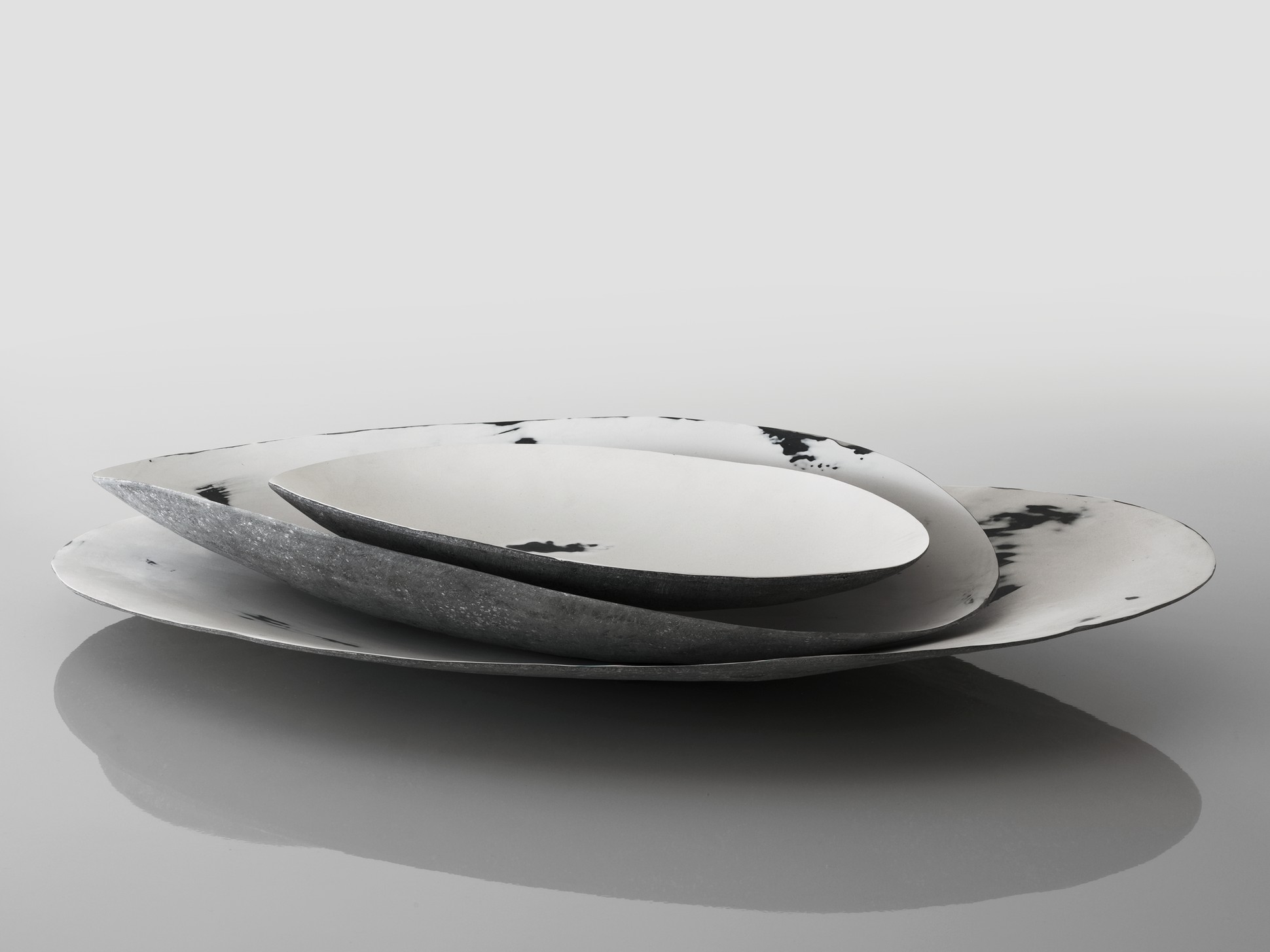 Vassoi come conchiglie, dai profili delicati ma resistenti. La natura ancora una volta presta i suoi disegni e le sue screziature all’arte, che ne attinge, dando vita a oggetti unici.