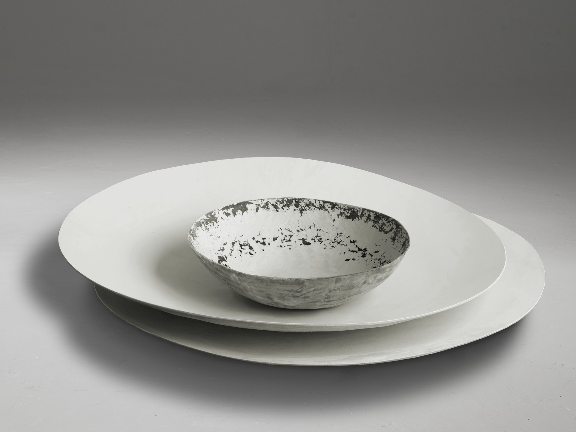 Ciotole dal disegno delicato e dalla forma di studiata imperfezione. Una lavorazione attenta e raffinata della vetroresina regala a queste creazioni i segni di un tempo immaginario.