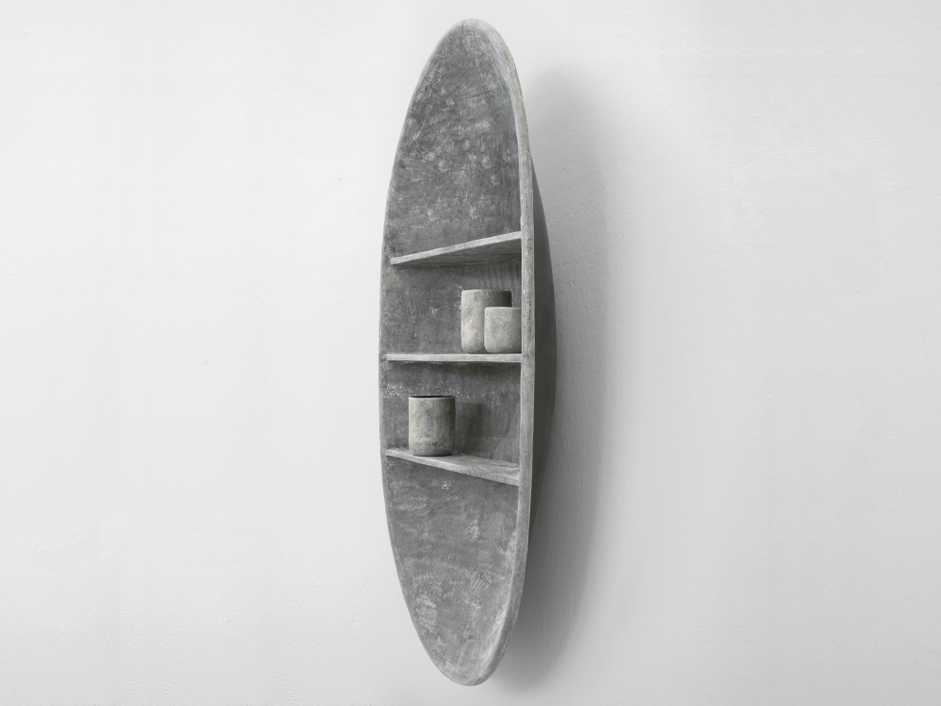 Come uno scudo antico che incanta con la sua foggia e protegge con la sua forza, questa creazione ha due anime. Ornamento scultoreo dalla forma gentile, ovale o rotonda, che si rivela libreria funzionale, grazie agli scaffali che ne fendono la superficie.