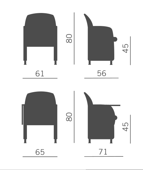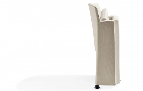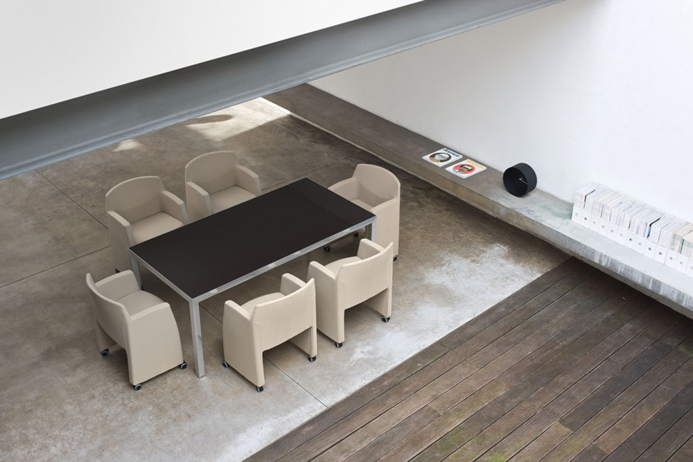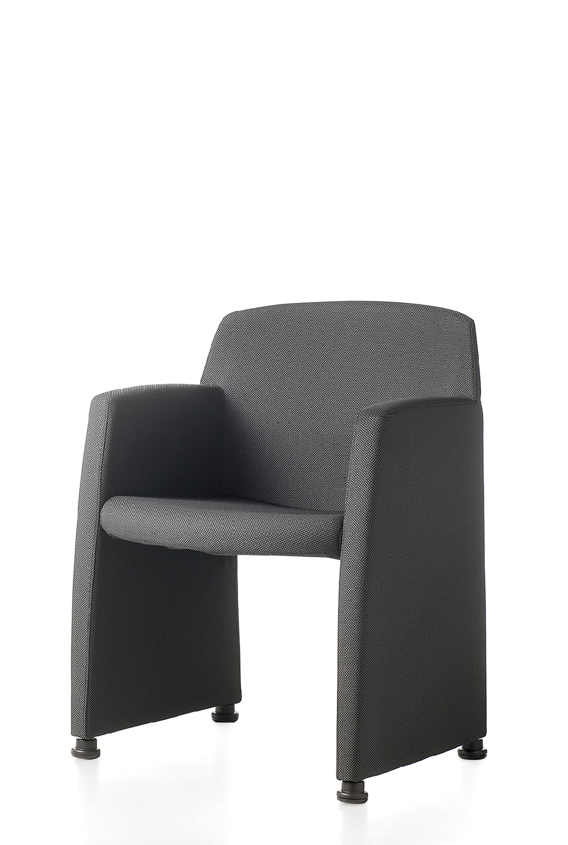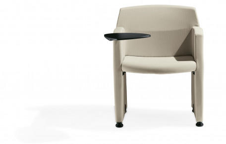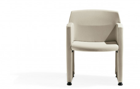Polyfunctional armchair with fixed or pliable side arms suitable for meeting and conference rooms.