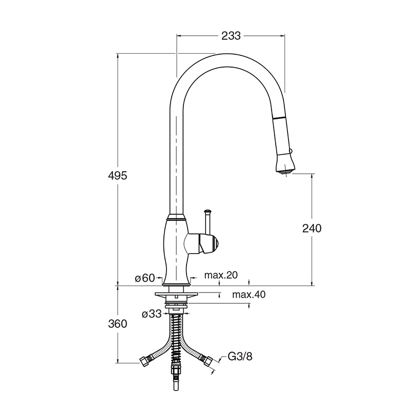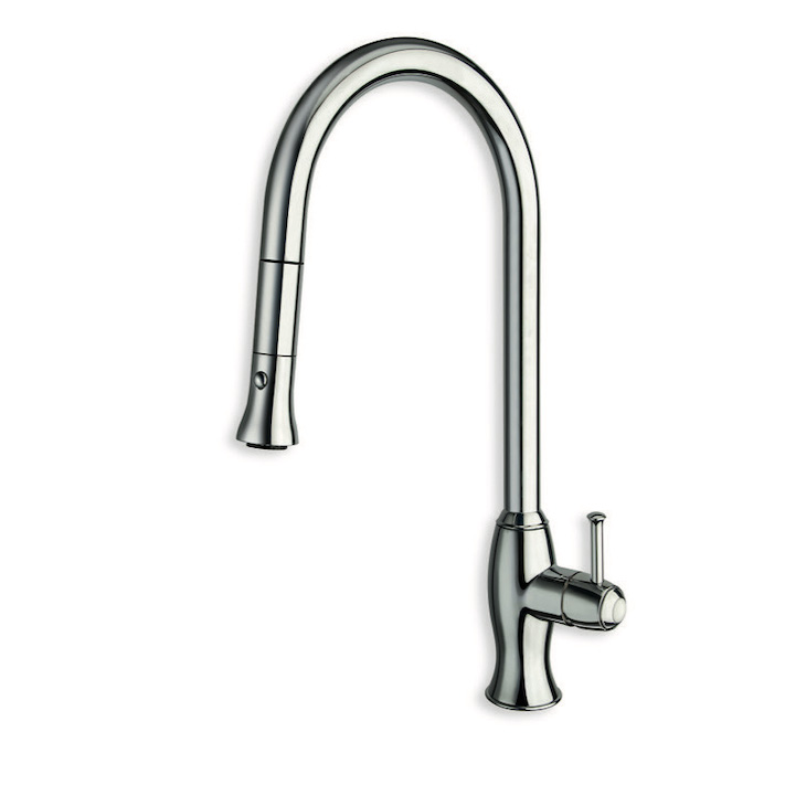 Miscelatore monocomando cucina, bocca orientabile, monoforo da piano, con miscelazione meccanica a doppio scatto laterale destra e doccetta estraibile a 2 getti, H. 495 mm