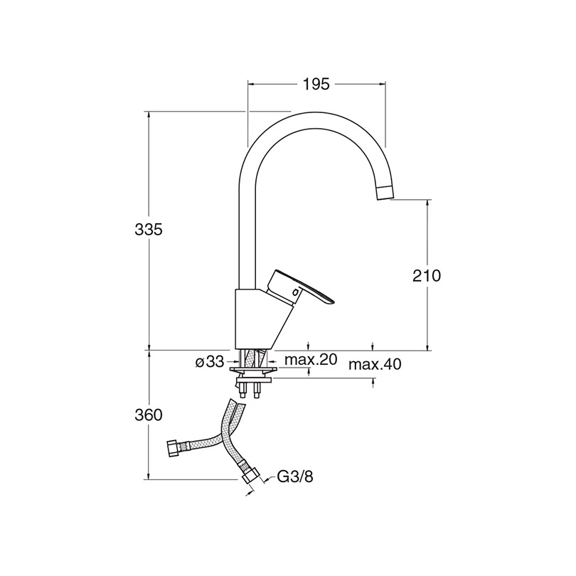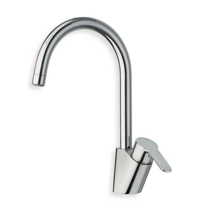 Miscelatore monocomando cucina, bocca orientabile, monoforo da piano, con miscelazione meccanica laterale destra. Corpo obliquo, H. 335 mm