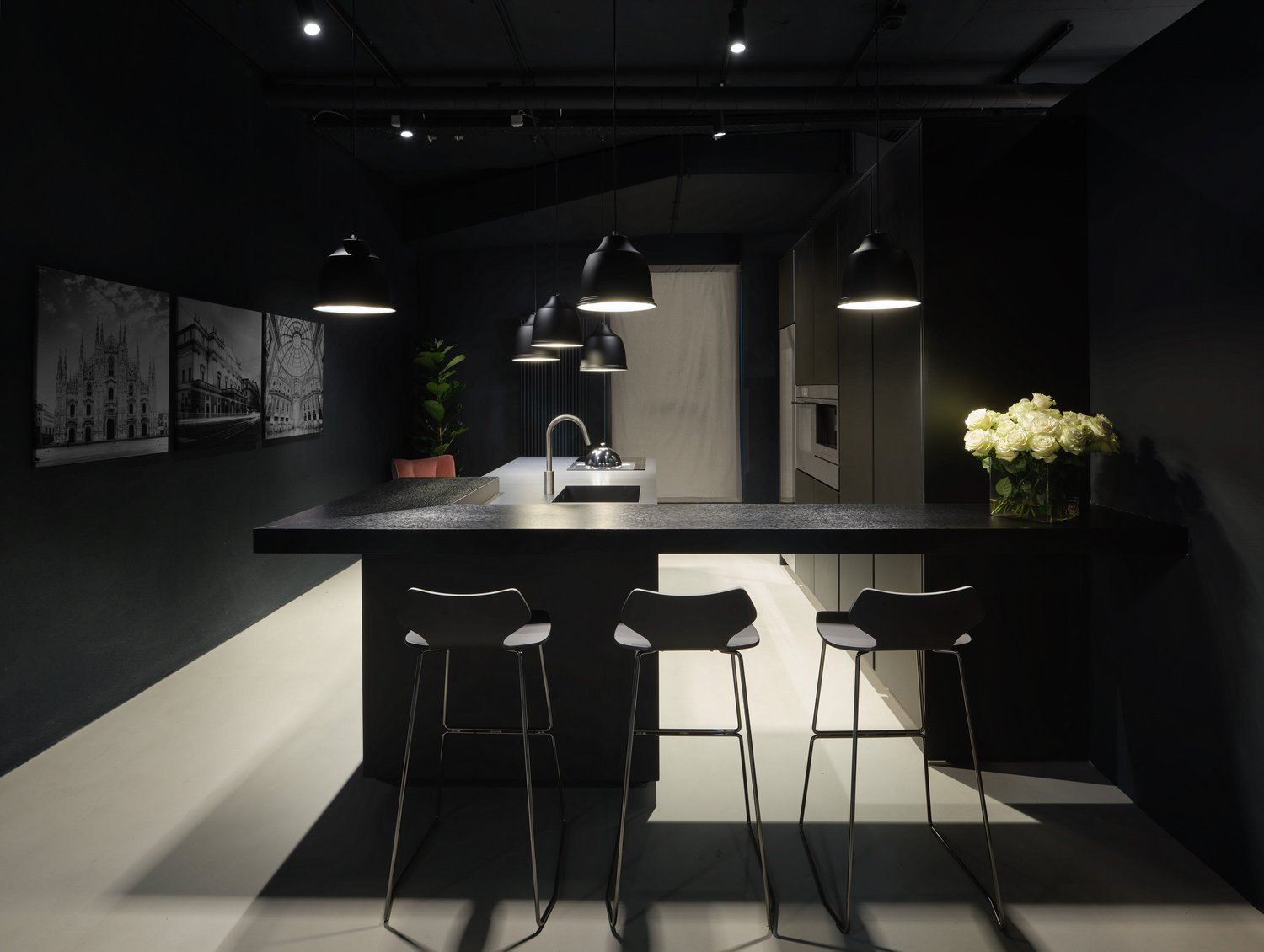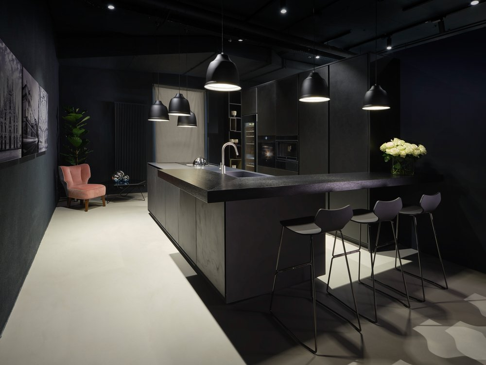 Cucina in Cemento Nero con Bancone Snack櫥柜