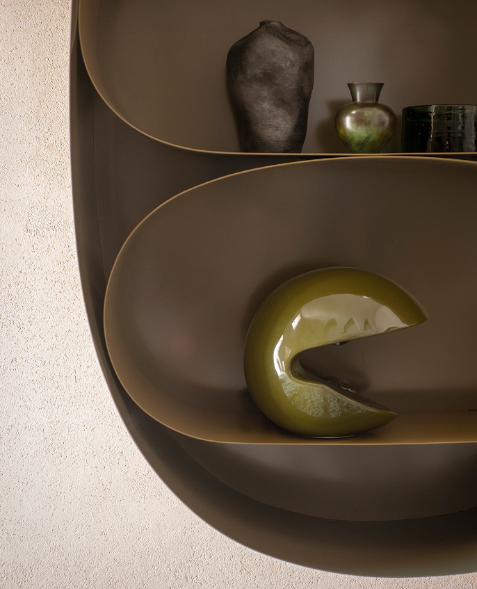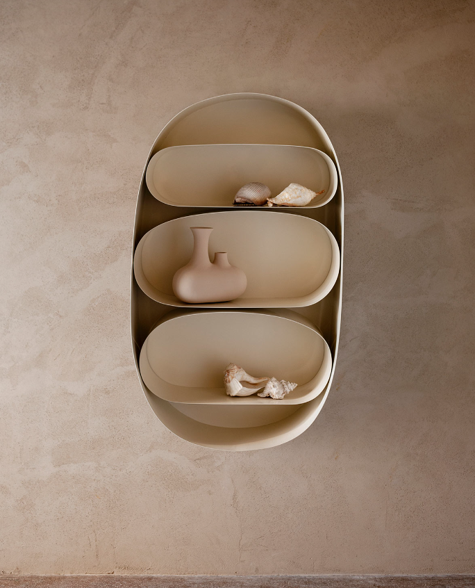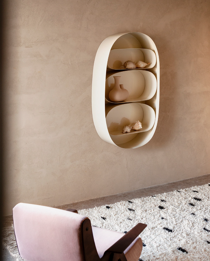 Astral is a metal cabinet forming part of Cosmic: Toogood’s collaborative collection with Tacchini. Like the other pieces in Cosmic, Astral celebrates irregular and elliptical shapes. Faye Toogood’s process is predominately rooted in hand-making maquettes out of everyday materials. The contours of Astral were first discovered in pliable aluminium mesh, then scaled up in steel. Like the Orbit tables or Lunar lights, the cabinet features soft shapes within shapes. Astral is designed with the playful and organic approach of the Toogood studio. Sculptural forms that unite the artistic with the everyday. The cabinet’s curves trick the eye and at first glance it appears Astral has no straight lines. The shelves are of course level and functional, ready for you to fill with your own curiosities.