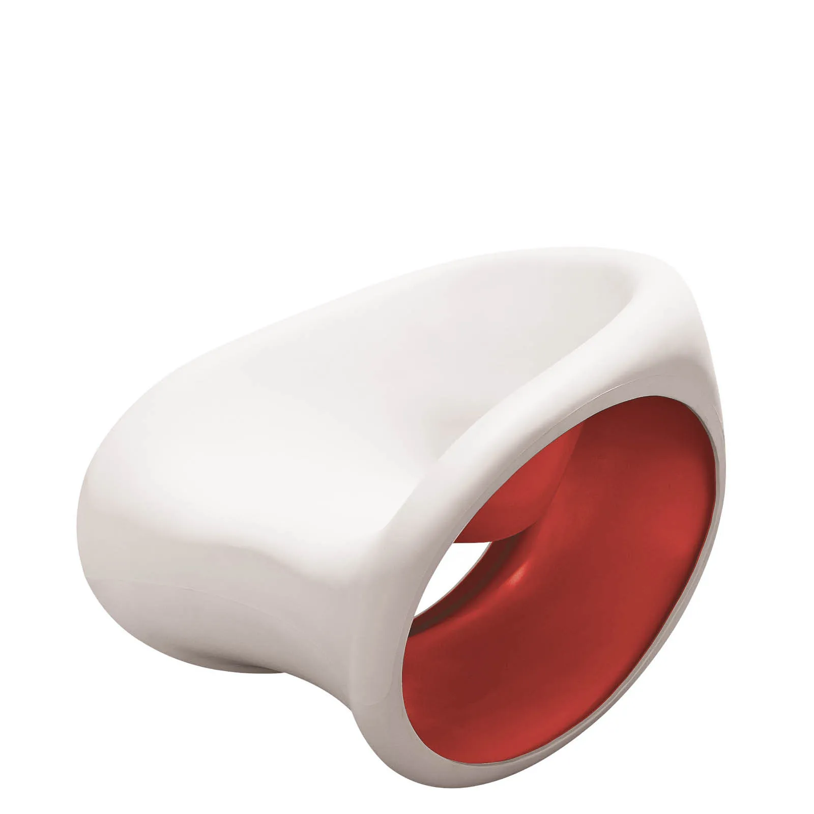 "MT”, ovvero la sigla che denomina questi pezzi progettati da Ron Arad, si pronuncia in lingua inglese “empty” vale a dire “vuoto” e il vuoto è veramente l’elemento caratterizzante di questo progetto. Il volume viene infatti scavato e presenta provocatoriamente il suo interno, finito in due colori. Questo è possibile grazie ad un doppio passaggio nella produzione in plastica rotazionale. In un primo momento viene immesso nello stampo il polietilene del colore della scocca esterna. Una volta formatosi tale strato, si procede ad inserire il secondo colore e a renderlo aderente al primo senza che nel processo, che avviene in alti forni, si fondano i due polimeri. Una volta estratto sarà un laser a cinque assi a tagliarne le estremità laterali e a svelare il bicolore di MT. Dal punto di vista tipologico inoltre va segnalata la presenza di una poltrona a dondolo, rarissima nella contemporaneità.