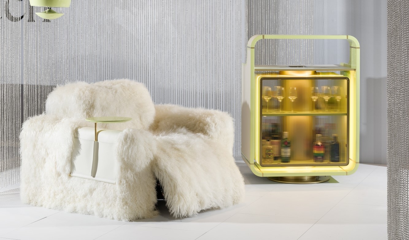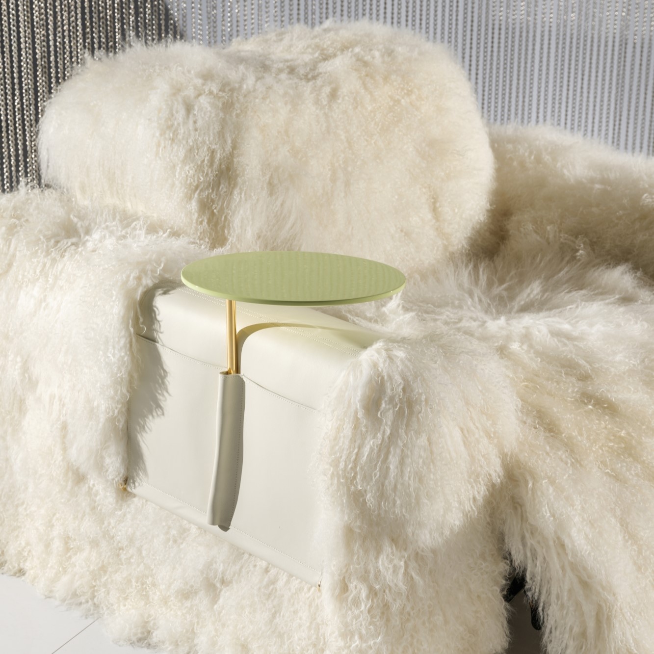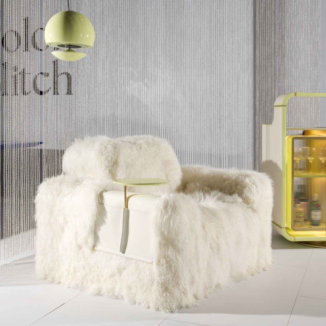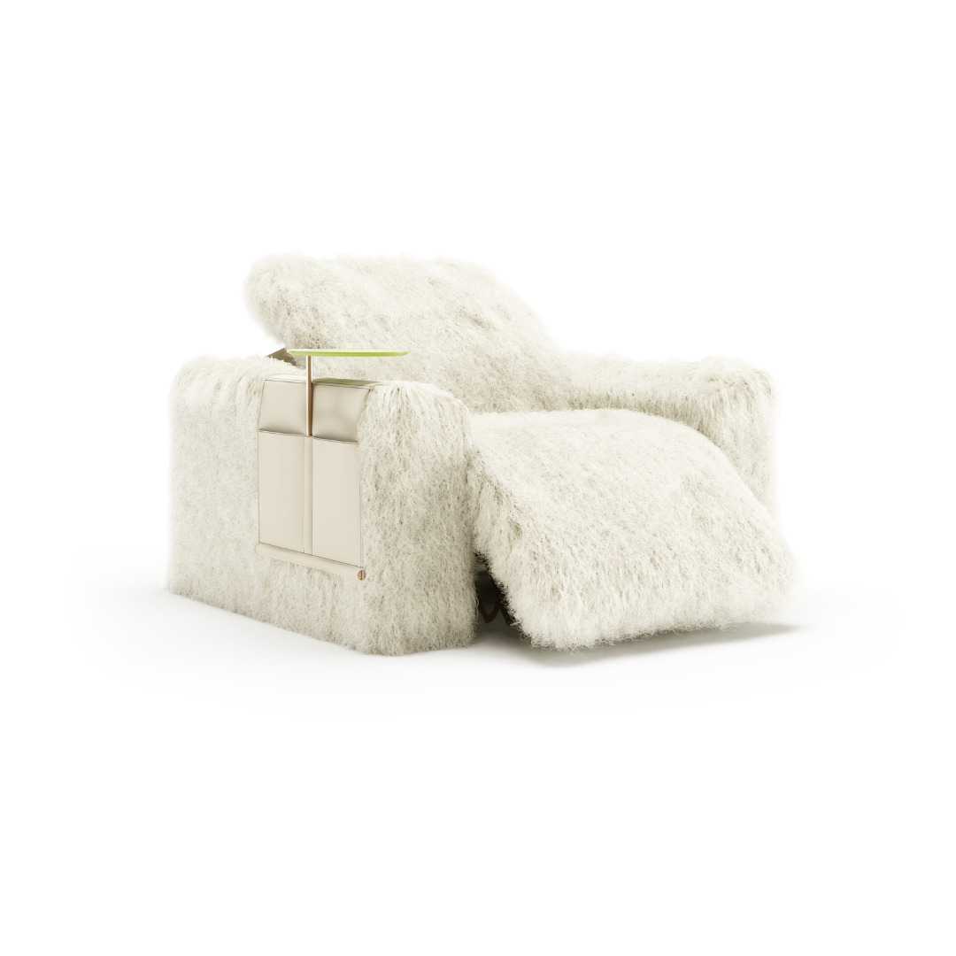 Dolly Kubrik è una poltrona reclinabile moderna rivestita in morbida Mongolia.