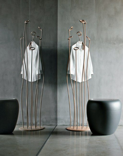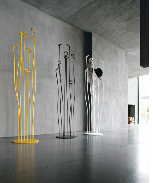 Alga nasce da un'idea di movimento, dalle linee morbide e pacate che si creano nel mondo sottomarino. Una struttura tubulare in metallo laccato che culmina con eleganti cerchi appendiabiti.