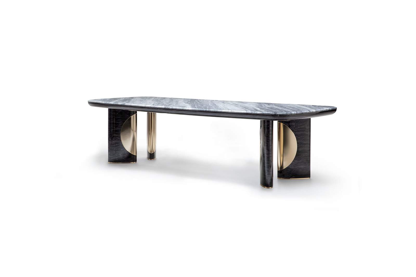 Rectangular table with grey Alpi marble top and base in Black Bubinga burl veneer with high gloss polyester finish. Base details in light gold chrome stainless steel.