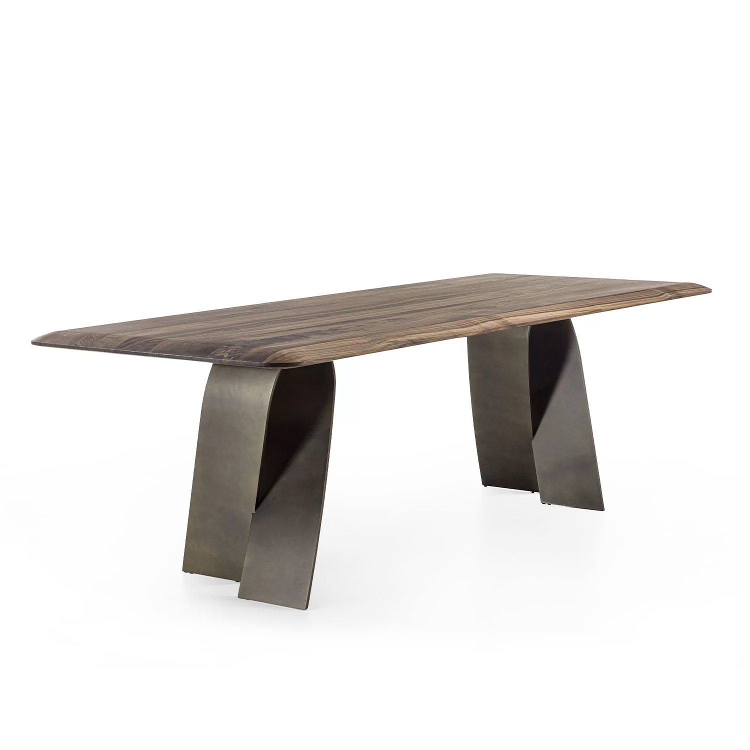 Tavolo con top in legno massello a liste incollate, caratterizzato da spessori assottigliati tramite lavorazione a saponetta per donare leggerezza e sinuosità, abbinato a gambe in ferro che si avvolgono su se stesse ad evocare la flessibilità di un nastro.
