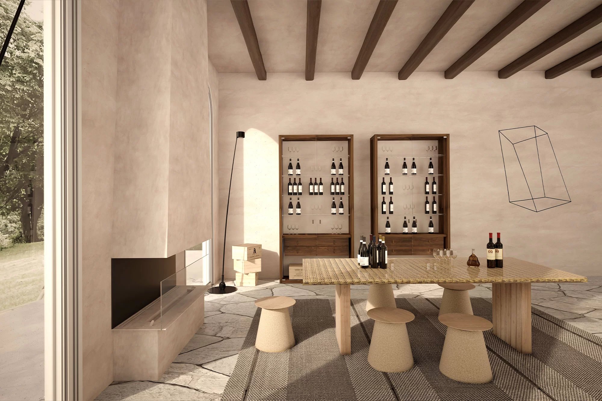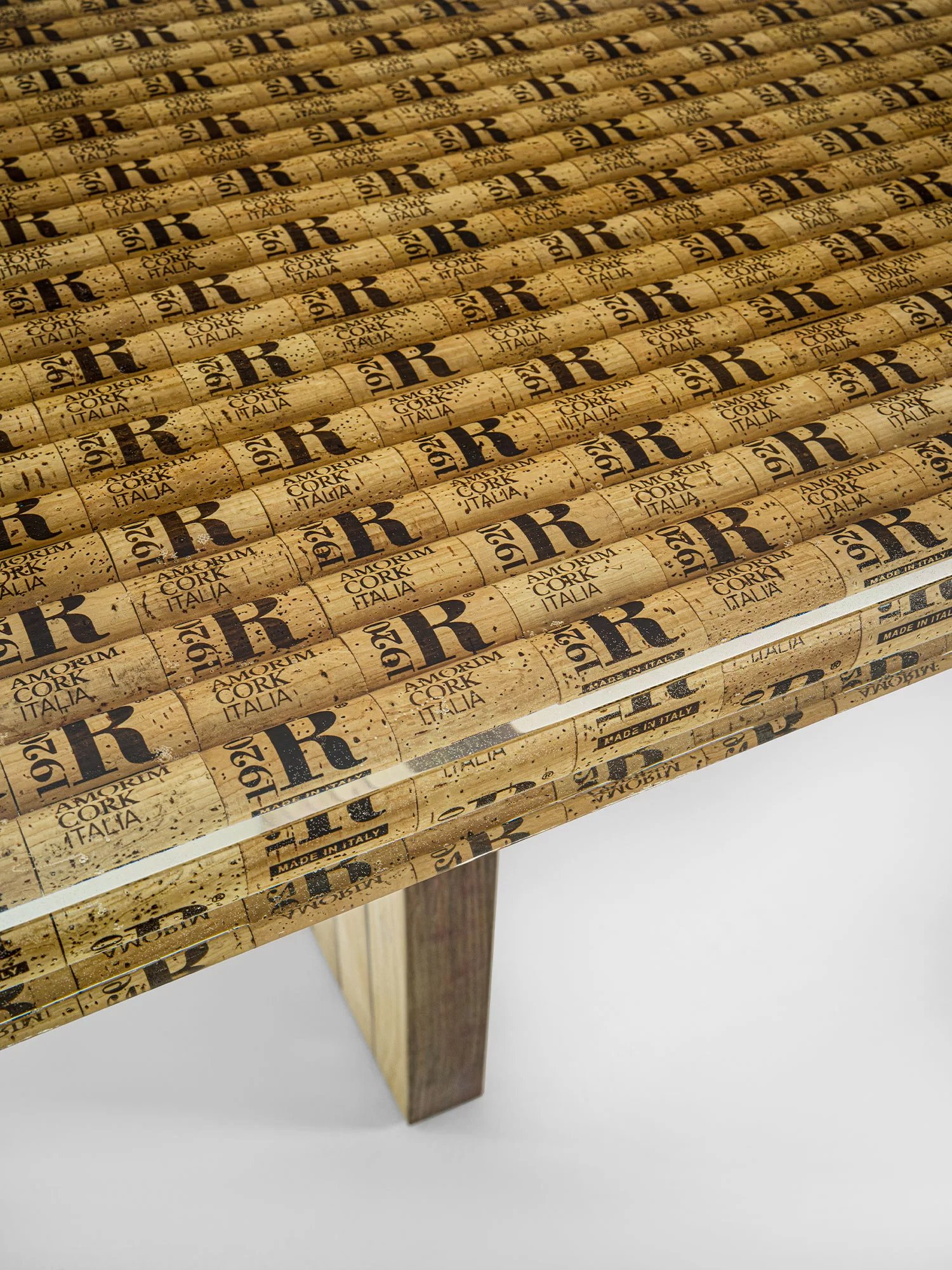 Tavolo con basamento in rovere proveniente dalle Barrique e top realizzato con tappi di bottiglia in sughero immersi nella resina.