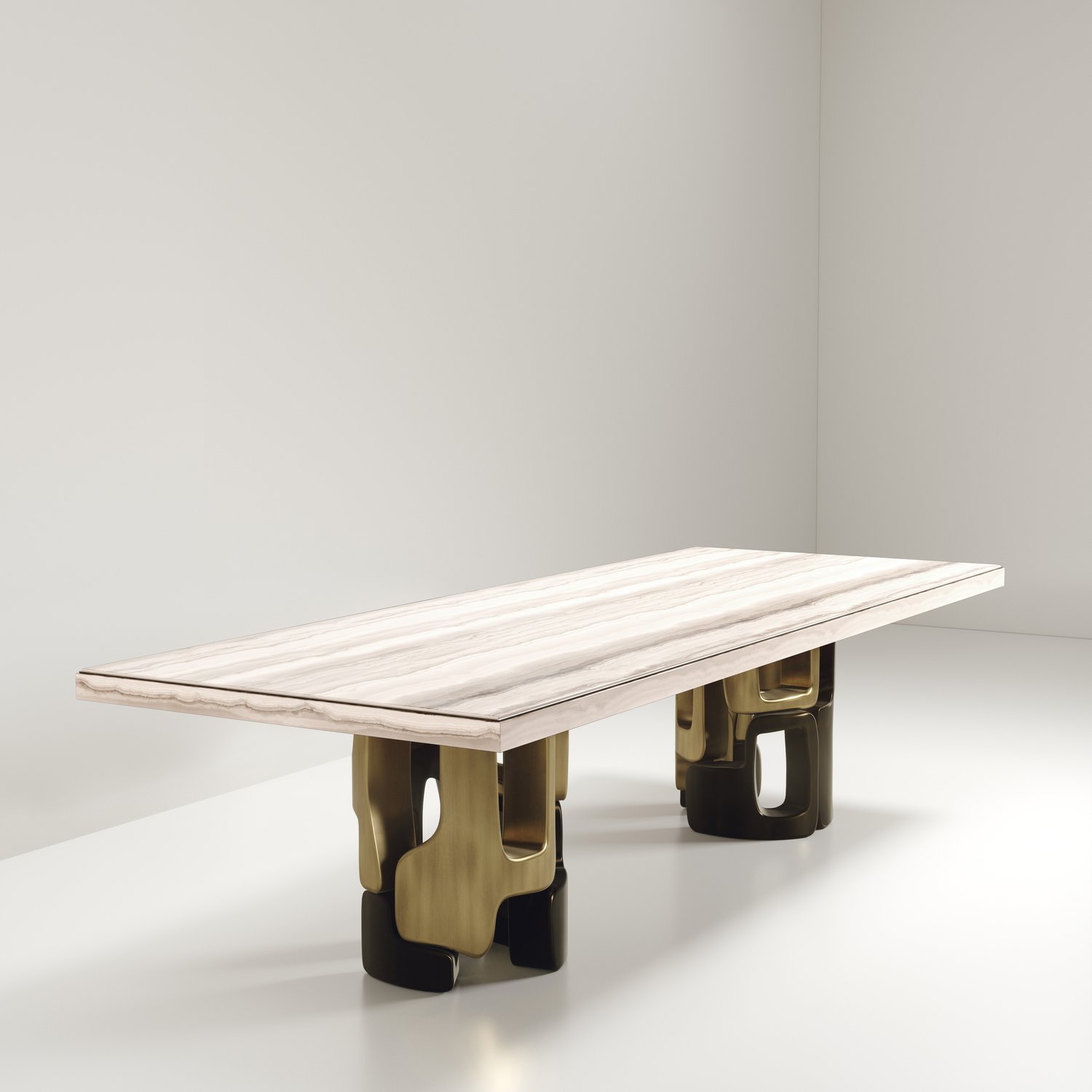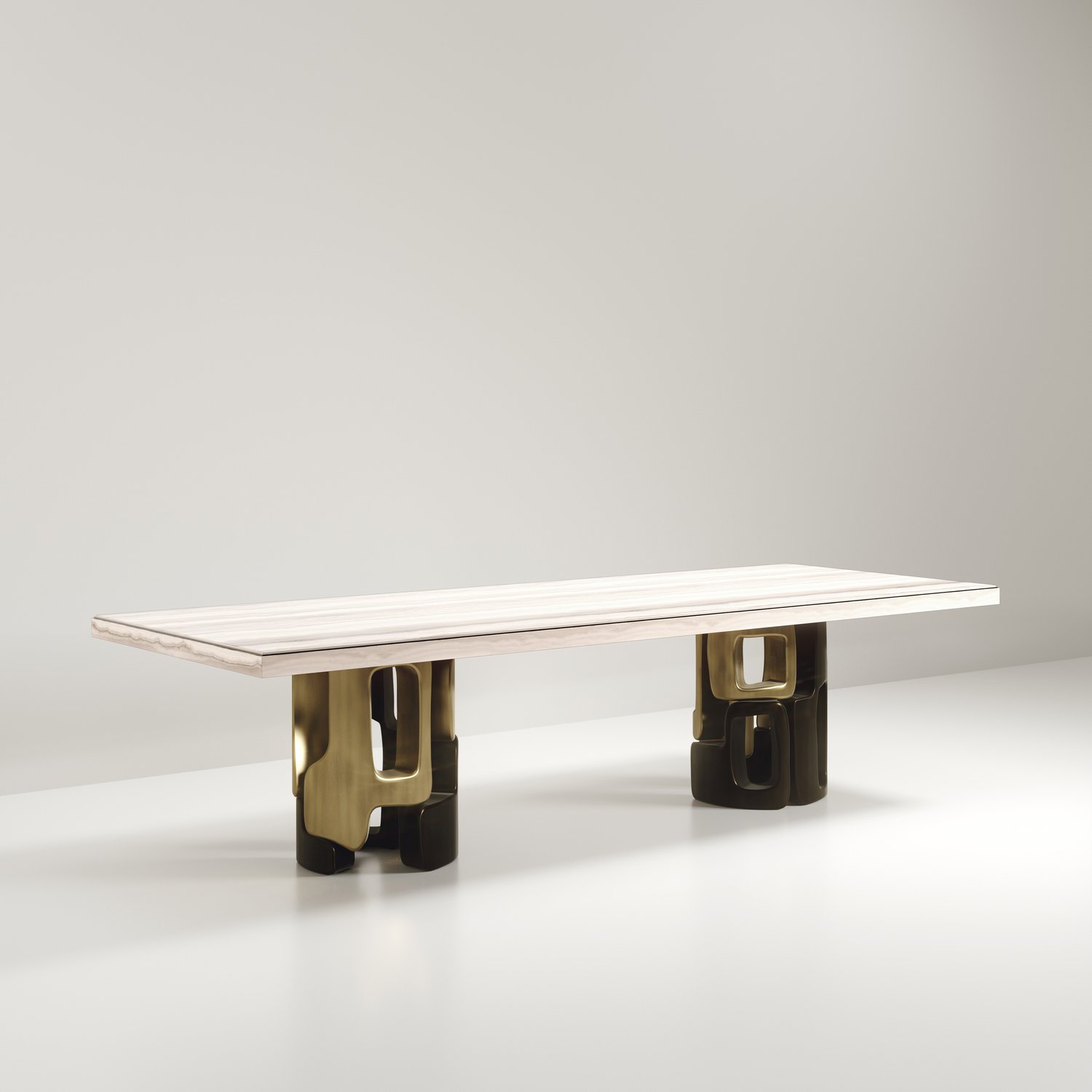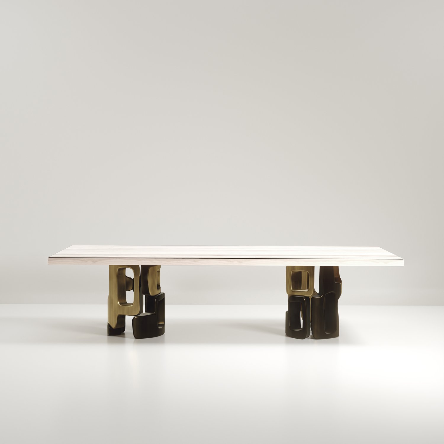 The Apoli I Dining table by Kifu Paris is both dramatic and organic in its unique design. The stunning semi-precious Tiger Eye Blue top sits on a pair of geometric and sculptural bronze-patina brass bases. This piece is designed by Kifu Augousti the daughter of Ria and Yiouri Augousti. Part of the Apoli Capsule Series, see images of collection at end of slide.