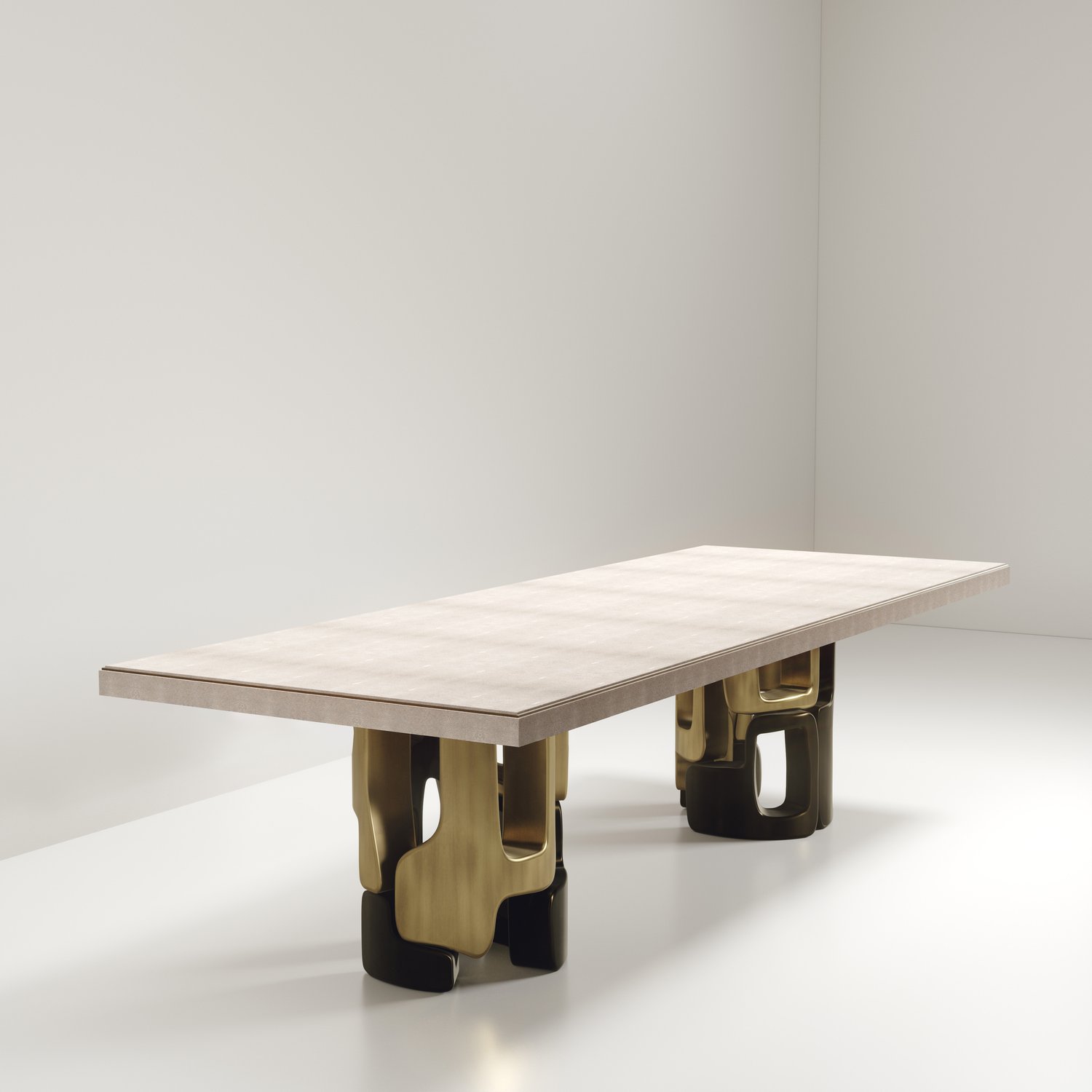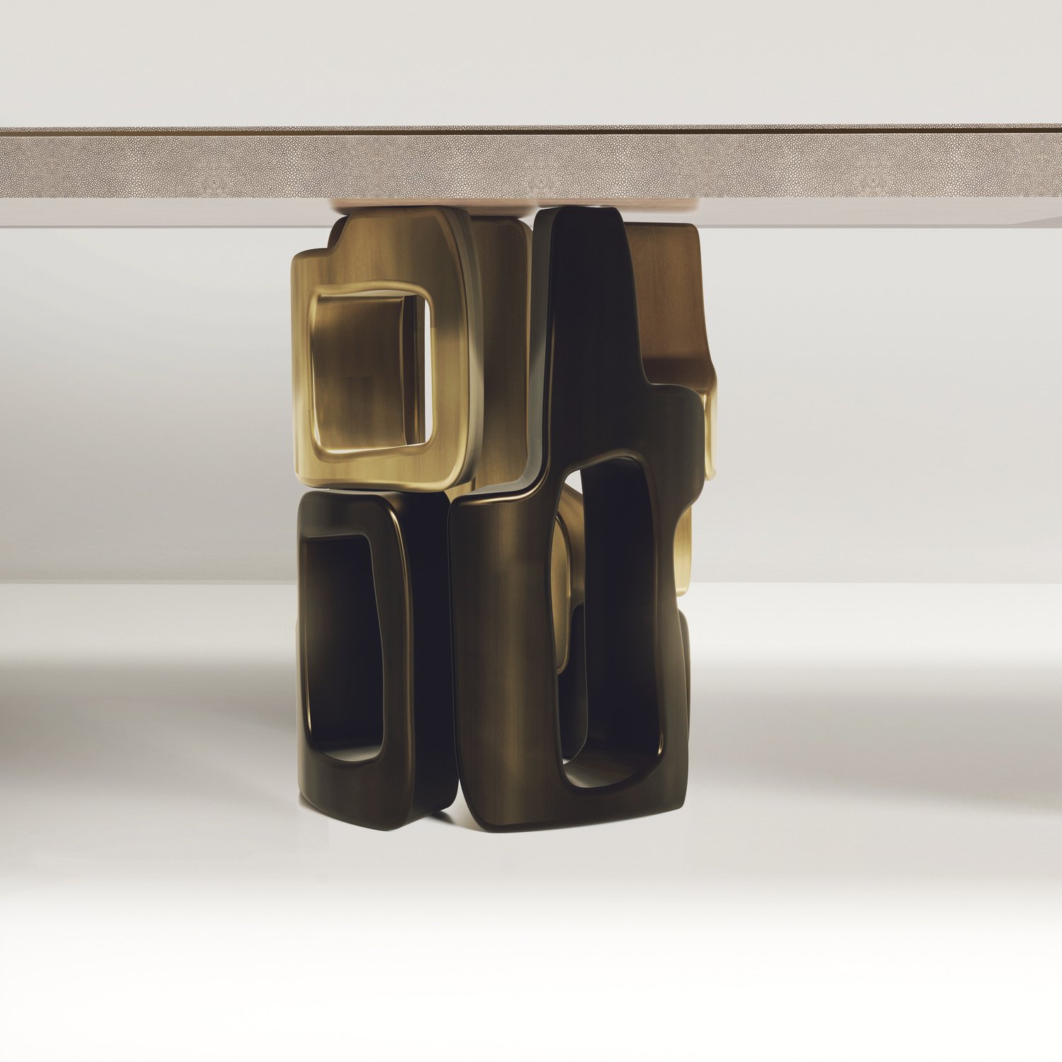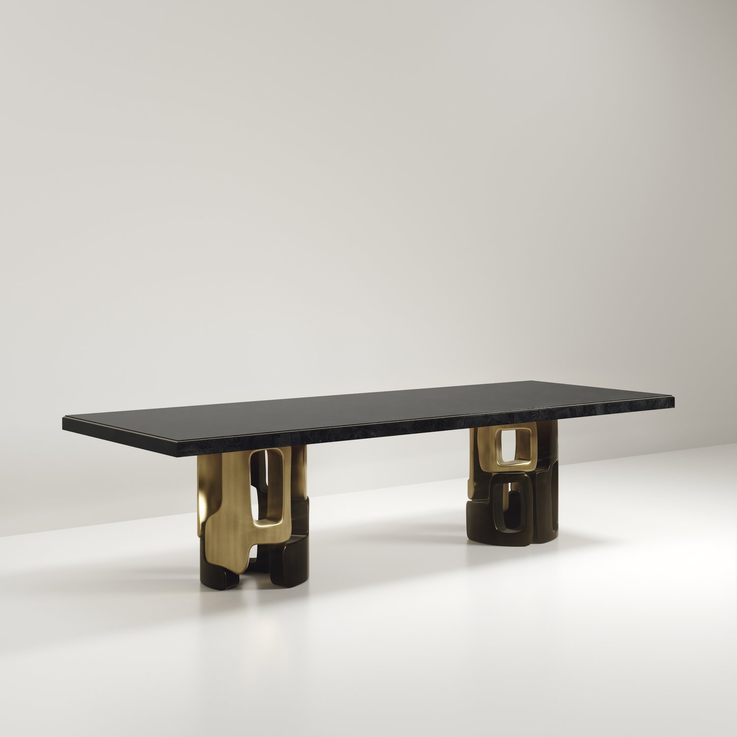 The Apoli I Dining table by Kifu Paris is both dramatic and organic in its unique design. The stunning semi-precious Tiger Eye Blue top sits on a pair of geometric and sculptural bronze-patina brass bases. This piece is designed by Kifu Augousti the daughter of Ria and Yiouri Augousti. Part of the Apoli Capsule Series, see images of collection at end of slide.